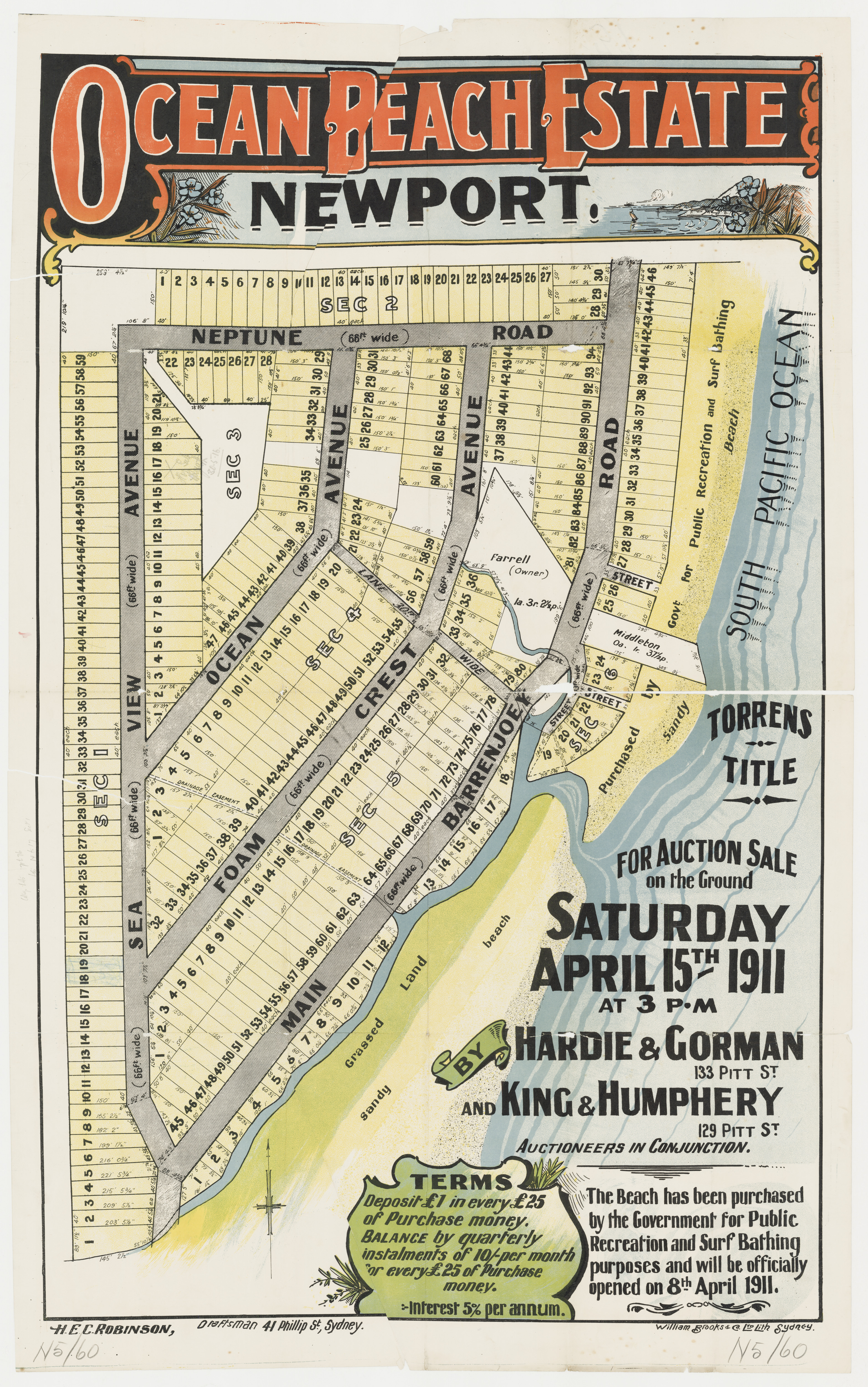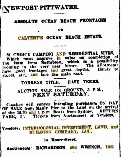 Richardson and Wrench, Ltd., report having sold, on behalf of the Intercolonial Investment, Land, and Building Company, Ltd., on the ground, on Saturday afternoon, 30 lots of Calvert's Beach Estate, Newport, Pittwater, at prices ranging from £2/3/ to 12/0 per foot. Total sales, £2035/4/. PROPERTY SALES. (1912, April 22). The Sydney Morning Herald (NSW : 1842 - 1954), p. 11. Retrieved from http://nla.gov.au/nla.news-article15358109