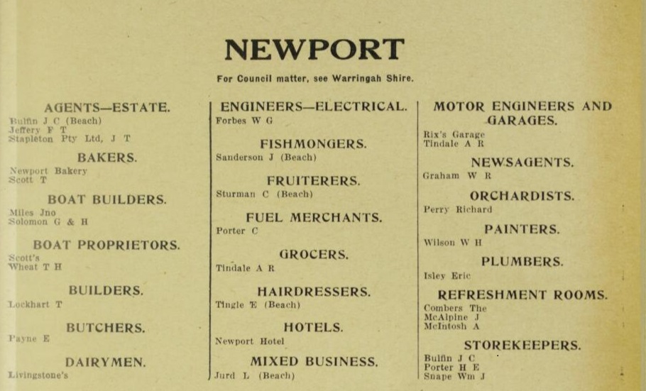 NEWPORT.— Comfortable Cottage, at surf. Sale or Let. Call Miss Berry's Cottage, Barrenjoey Road, Newport. Advertising (1923, January 27). The Daily Telegraph (Sydney, NSW : 1883 - 1930), p. 5. Retrieved from http://nla.gov.au/nla.news-article245832065