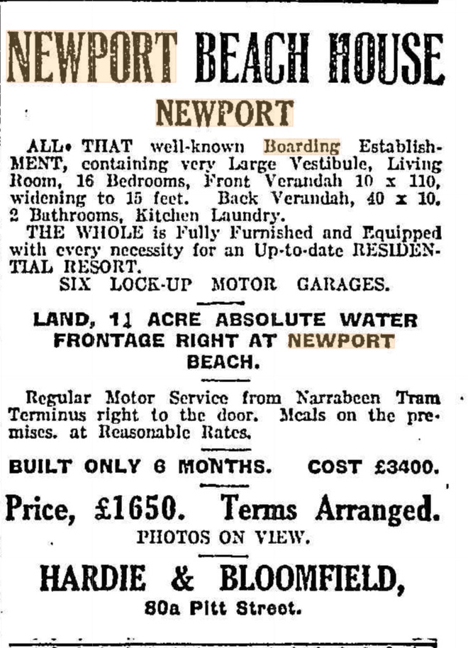 NEWPORT.-Newly Furnished 4rm. Bungalow, 13oft water frontage to Pittwater. Will let for a term, option purchase at £450. A Gift. Also 5-rm. Cott. nr. hotel, opp. wharf. Will let with option purchase £600. Some splendid Week (end) Building Sites, cheap. F. KLEEMO, 217 Clarence-street, Sydney. Advertising (1918, March 23). The Sydney Morning Herald (NSW : 1842 - 1954), p. 17. Retrieved from http://nla.gov.au/nla.news-article15775411