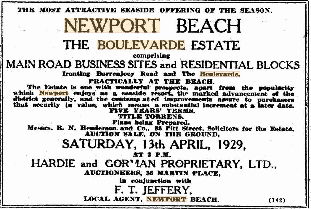 OWNER of 30 Allotments, Newport Township, wishes to sell half interest on building partnership. Rupert V. Minnett, Architect, 70 Pitt-street. Advertising (1913, July 23). The Sydney Morning Herald (NSW : 1842 - 1954), p. 19. Retrieved from http://nla.gov.au/nla.news-article15437599