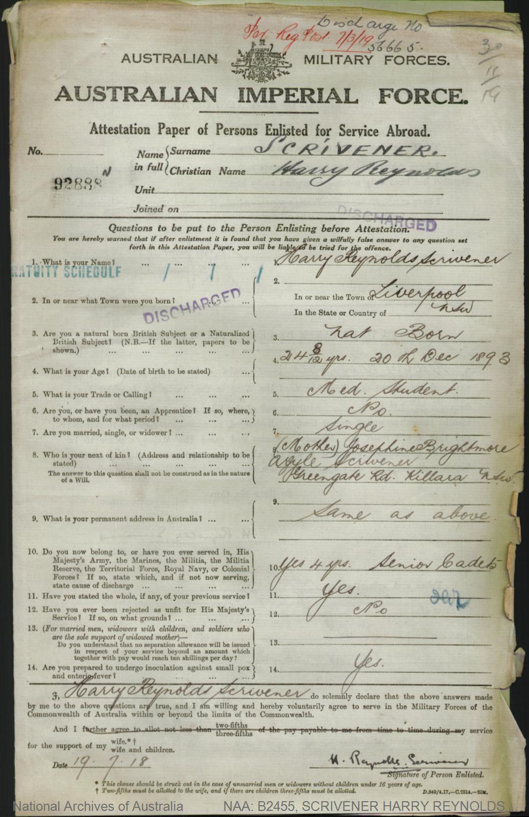 He enlisted on August 20th, 1917, aged 32 and 11 months, Captain Stanley Spain signing his attestation paper. He married Coral Maddrell, youngest daughter of Mr. Henry F. Muddrell, of "Mona," Braidwood, on Saturday October 20th, 1917. He did not leave until the next year, possibly fulfilling work contracts, but was serving in France by August 1918. He was a Private with the 35th Battalion on enlistment but eventually earned a commission as Second Lieutenant. He came home and disembarked on March 5th, 1919 and went straight back to work, playing cricket and being an outstanding member of the Australian Automobile Club, even arranging a 'splendid motor car procession for soldiers' orphans' for that years Anzac Memorial Day.