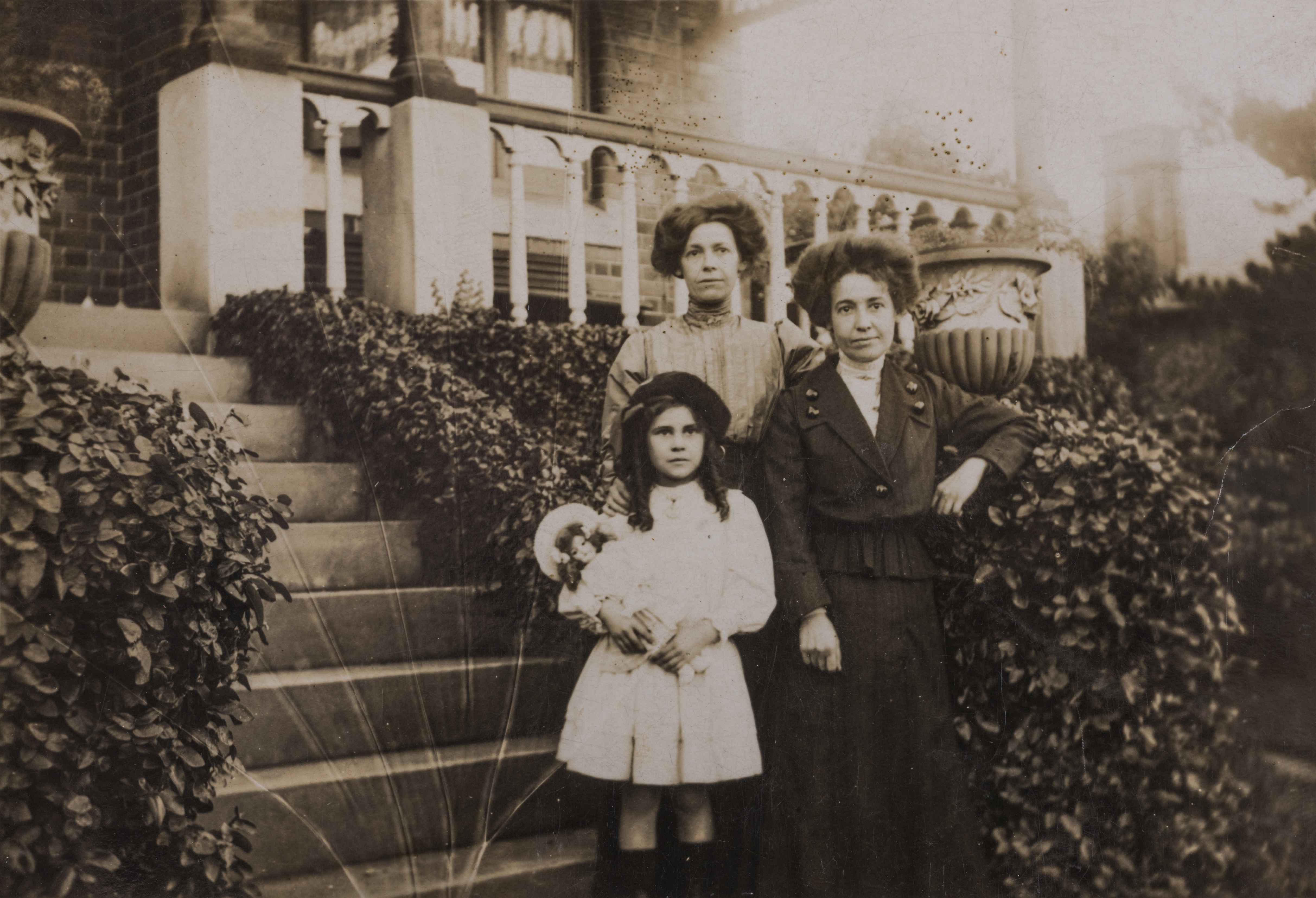 Unknown women (possibly Una, daughter, Lillie, wife, and Lily, sister) in front of house, possibly in Muston Street, Mosman, c. 1915. Written on the back is ''Kleemos home ? and 'Topaz' Muston street Mosman''. Image courtesy Mosman Council, CC by.