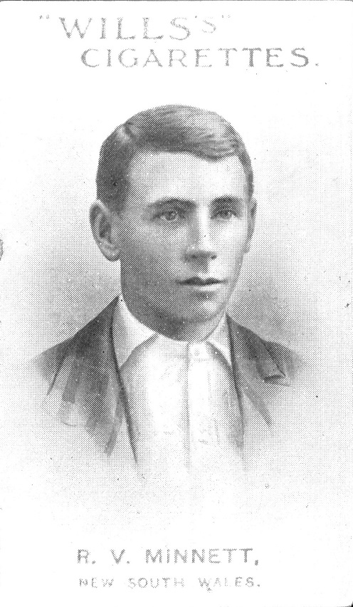 Rupert V. Minnett is 22 years of age. He is a son of Mr. J. A. Minnett, the treasurer of the Royal Sydney Yacht Club, and an enthusiastic yachtsman being a well-known figure in the Thelma. Rupert was born at North Sydney and learned his cricket at the Church of England Grammar School, under the coaching of 'Sam' Jones, who was a member of some Australian Elevens.