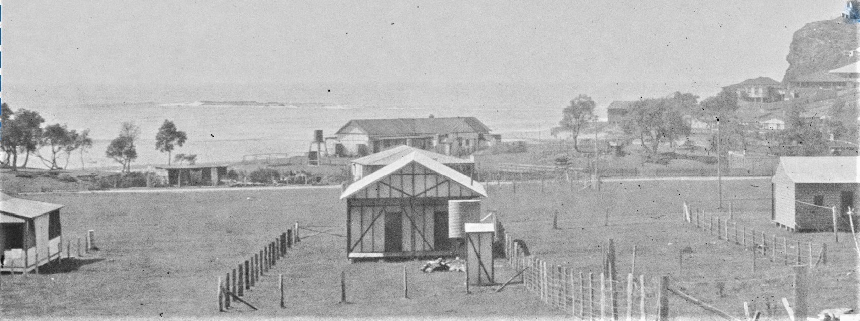 Smaller section from Broadhurst postcard circa 1911 (beach shows 'bathing sheds' installed as party of 1911 resumed beach celebrations') and Tea Pot Inn on beachfront with Farrell's farm sheds at rear and fences now taken down. Broadhurst Postcard possibly commissioned for 1911 land sale. Newport Beach 1911 resumed beach celebration notes under 'Extras'.