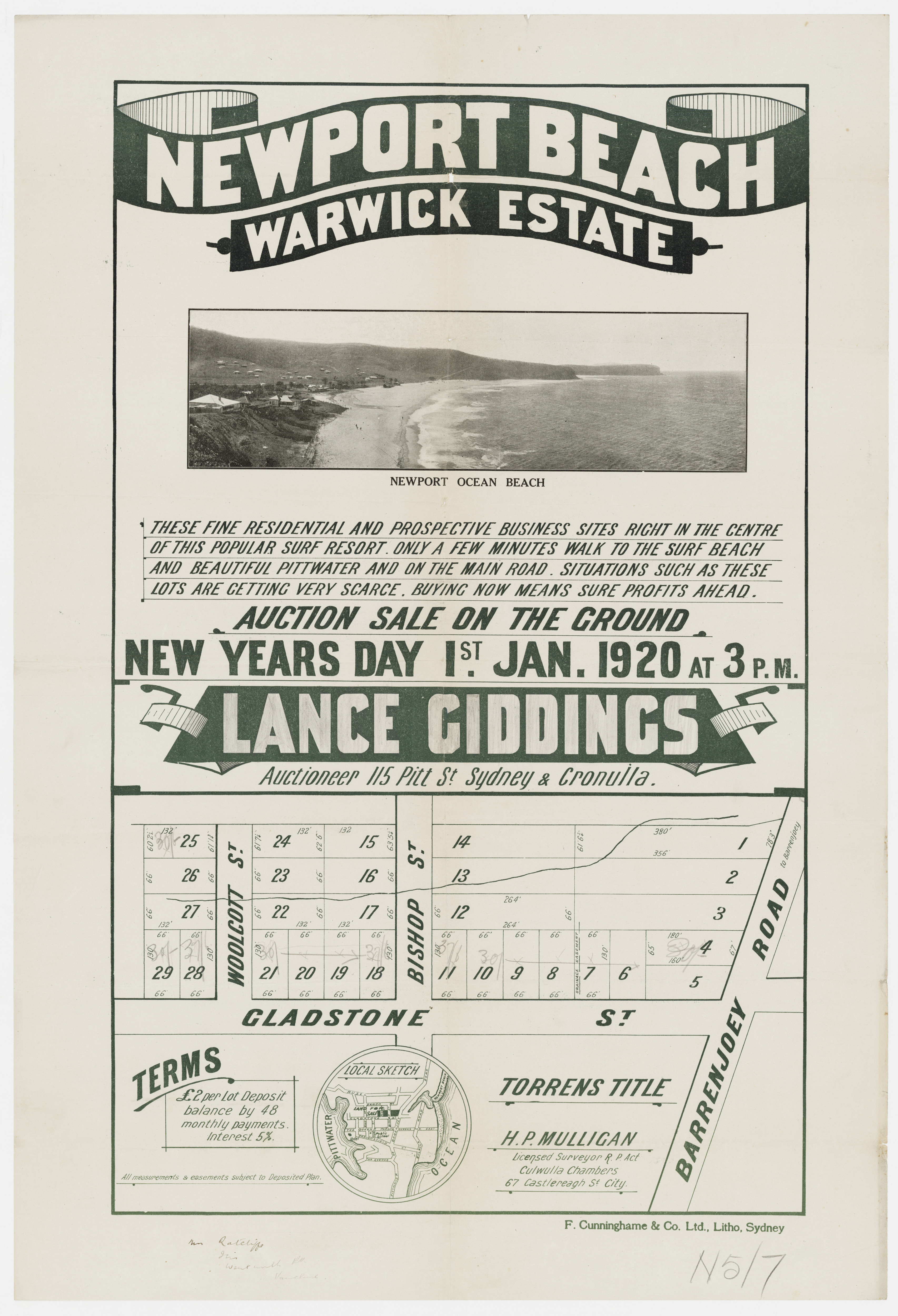 LAND:—County Cumberland, parish Narrabeen, shire Warringah, 132 acres 2 roods, on McMahon's Creek and South Pacific Ocean,— being lands granted as 60 acres (portion 21 of parish) and 30 acres (portion 23 of parish) to John Farrell, and 50 acres (portion 22 of parish) to Martin Burke, and part 50 acres (portion 38 of parish) granted to Robert Henderson, and also part 1200 acres (portion 20 of parish) granted to the Reverend John Joseph Therry, exclusive of the road 1 chain wide from Manly to Barranjoey, the area of which has been deducted from the total area; adjoining properties of M. Dowling and A. M. Bowman, P. J. Shopee, J. Stevenson, W. C. Woolcott, G. Skinner, J. H. Slater, S. Oliver, M. Eason, J. McGlynn, A. Middows, New South Wales Realty Co., W. S. de Wilde, and H. M. Malcolm and Crown Land. NOTICE UNDER REAL PROPERTY ACT. (1910, February 23). Government Gazette of the State of New South Wales (Sydney, NSW : 1901 - 2001), p. 1112. Retrieved from http://nla.gov.au/nla.news-article227062930
