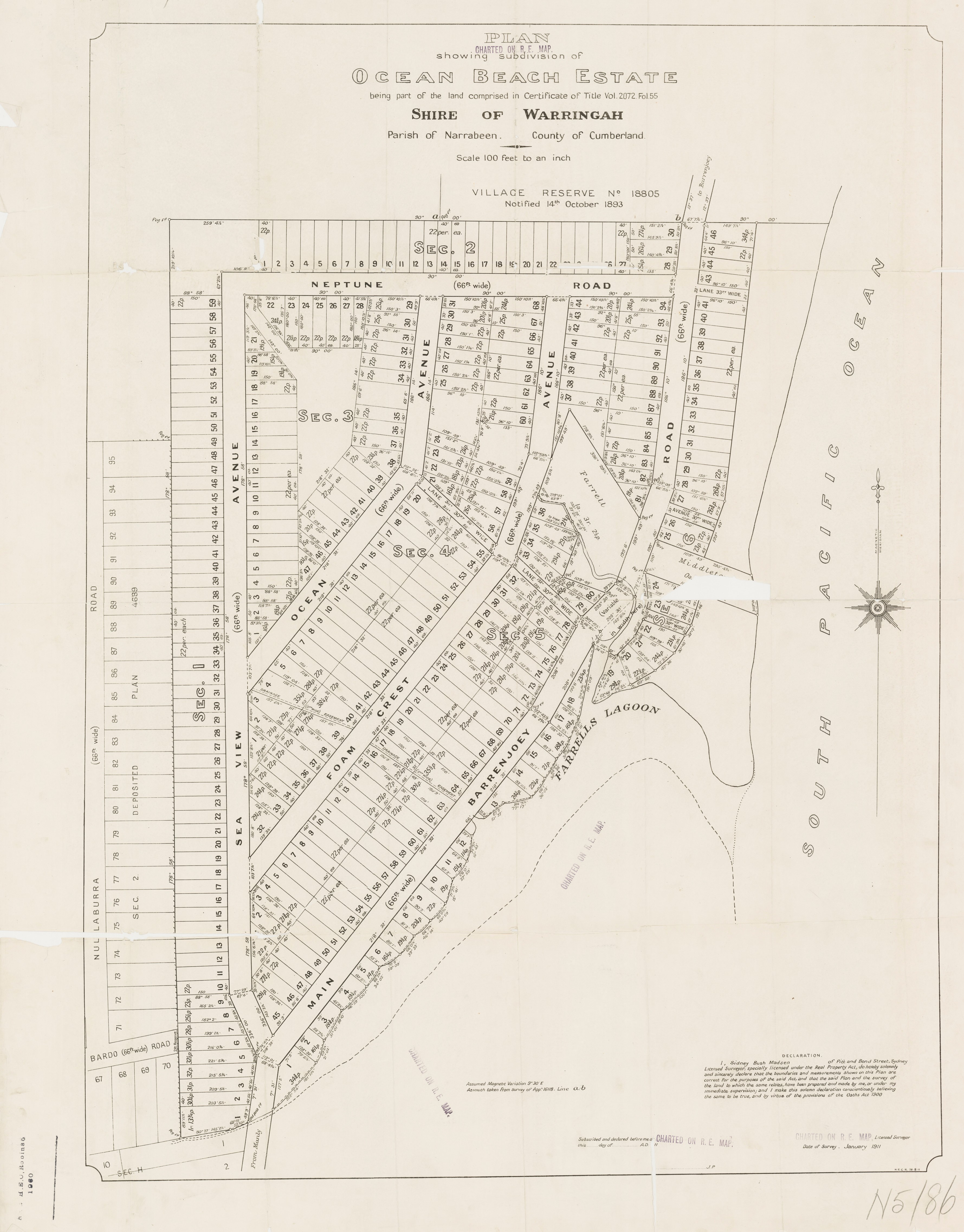 Plan showing subdivision of Ocean Beach Estate - for subdivider and Warringah Shire council - date of Survey January, 1911 - done by Sidney Bush Madsen, Surveyor. Item No.: c050400061