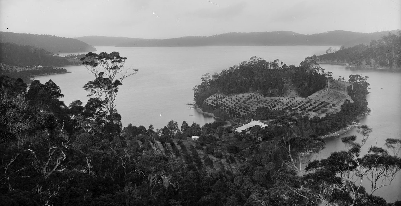'Scotland Island, Newport, Pittwater, N.S.W.', photo by Henry King, Sydney, Australia, c. 1880-1886. and section from to show cottage on neck of peninsula at western end with no chimneys through roof. From Tyrell Collection, courtesy Powerhouse Museum