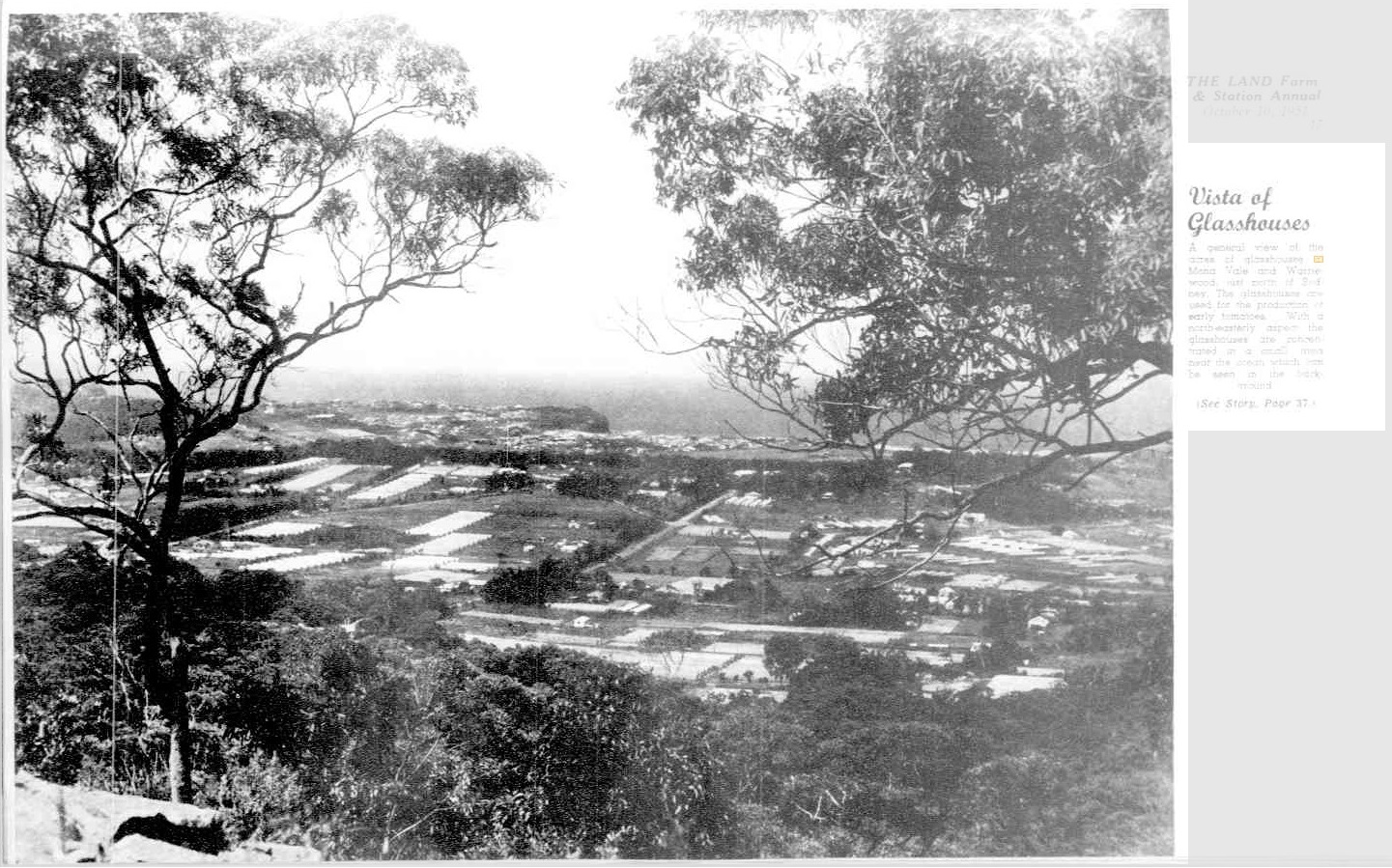 Less than 10 miles from Manly, Pittwater-road comes to a low hill around which it throws an arm, "Warriewood-road. When this by way gets out' of sight of the main thoroughfare it sweeps in a wide curve to Elanora Heights. At this end of Warriewood-road, and in the deep valley that runs across it from Vineyard-street to MacPherson-street, live the men of the glasshouses — Yugoslavs. In the open valley, on the side of the hill, and through the trees in every direction, what appear to be huge patches of snow gleam under the hot rays of the sun which no breeze tempers. But they are white-washed glasshouses which cover early tomatoes.