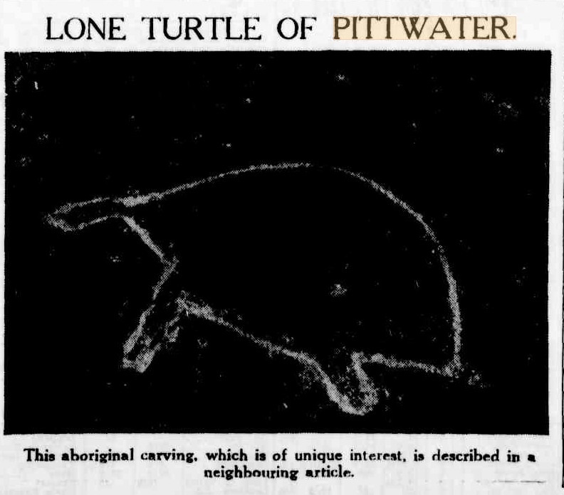This aboriginal carving, which is of unique interest, is described in the neighbouring article. LONE TURTLE OF PITTWATER. (1940, January 6). The Sydney Morning Herald (NSW : 1842 - 1954), p. 11. Retrieved from http://nla.gov.au/nla.news-article17653541