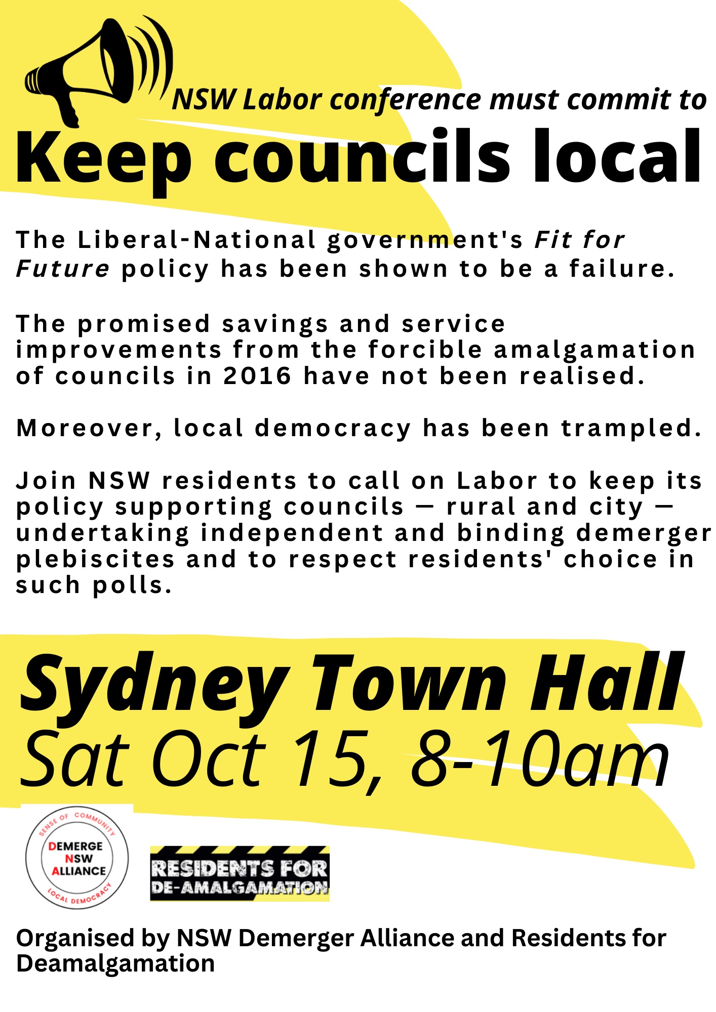 Demerge NSW Alliance (DNA) chairman Grantley Ingram called on residents from across the state to converge outside the 2022 Labor State Conference at Sydney Town Hall from 8am to 10am on Saturday, October 15, to encourage delegates to maintain the same policy the party took to the NSW election.