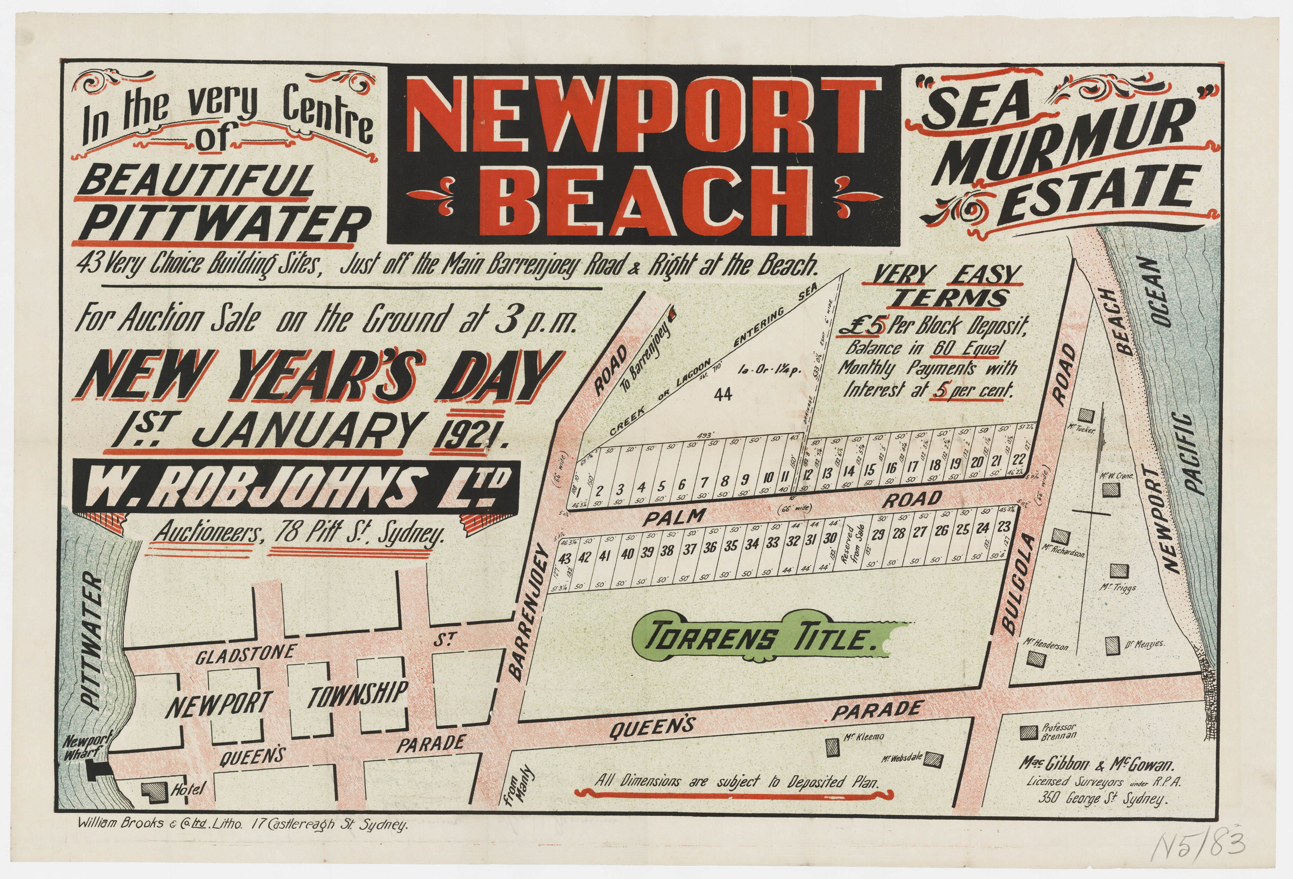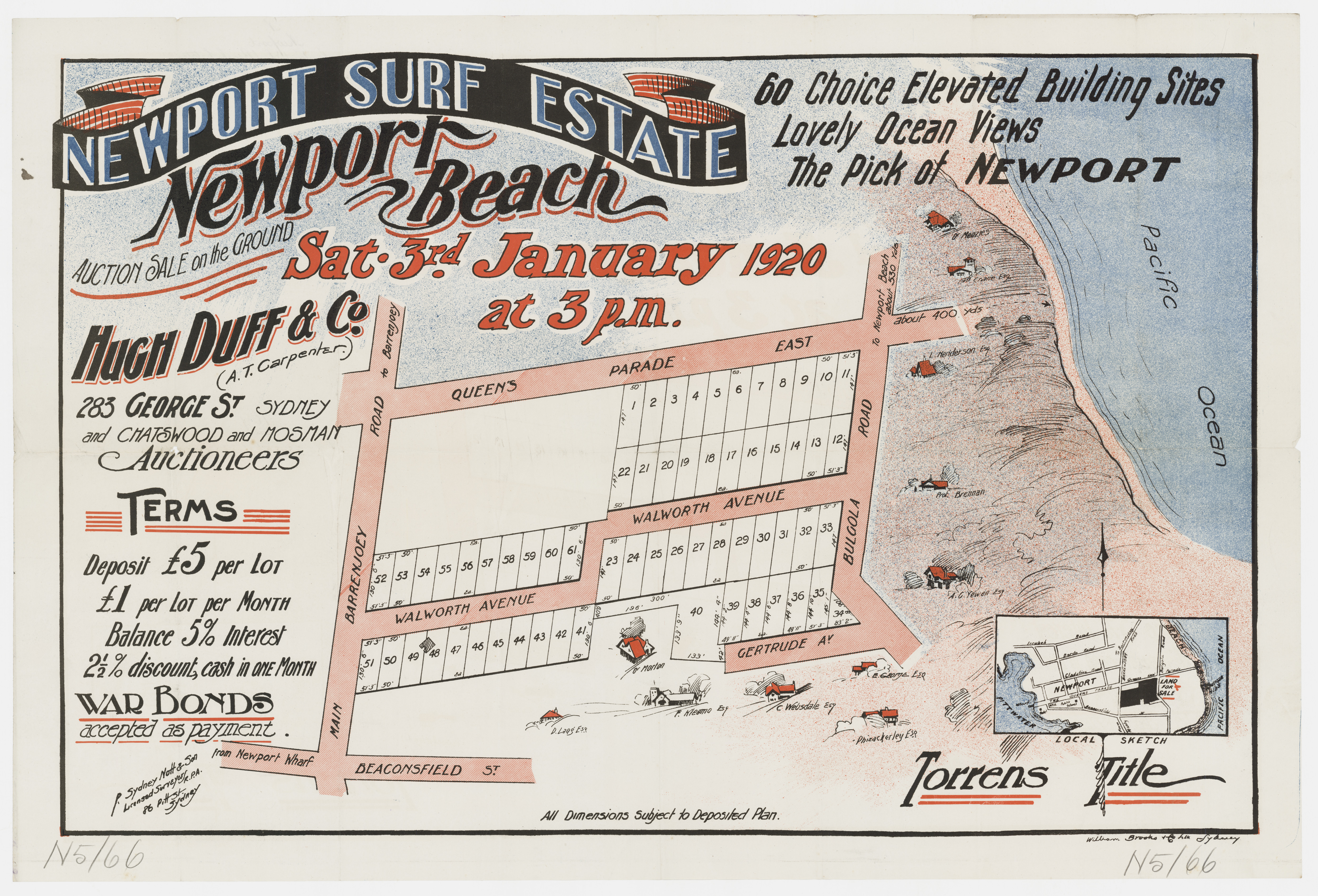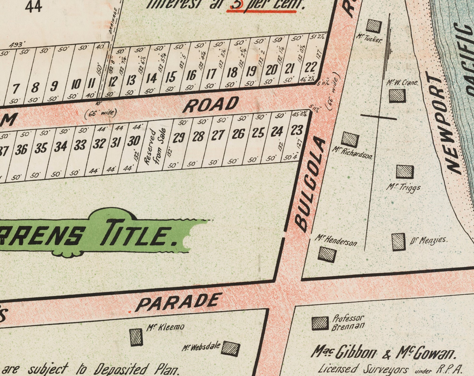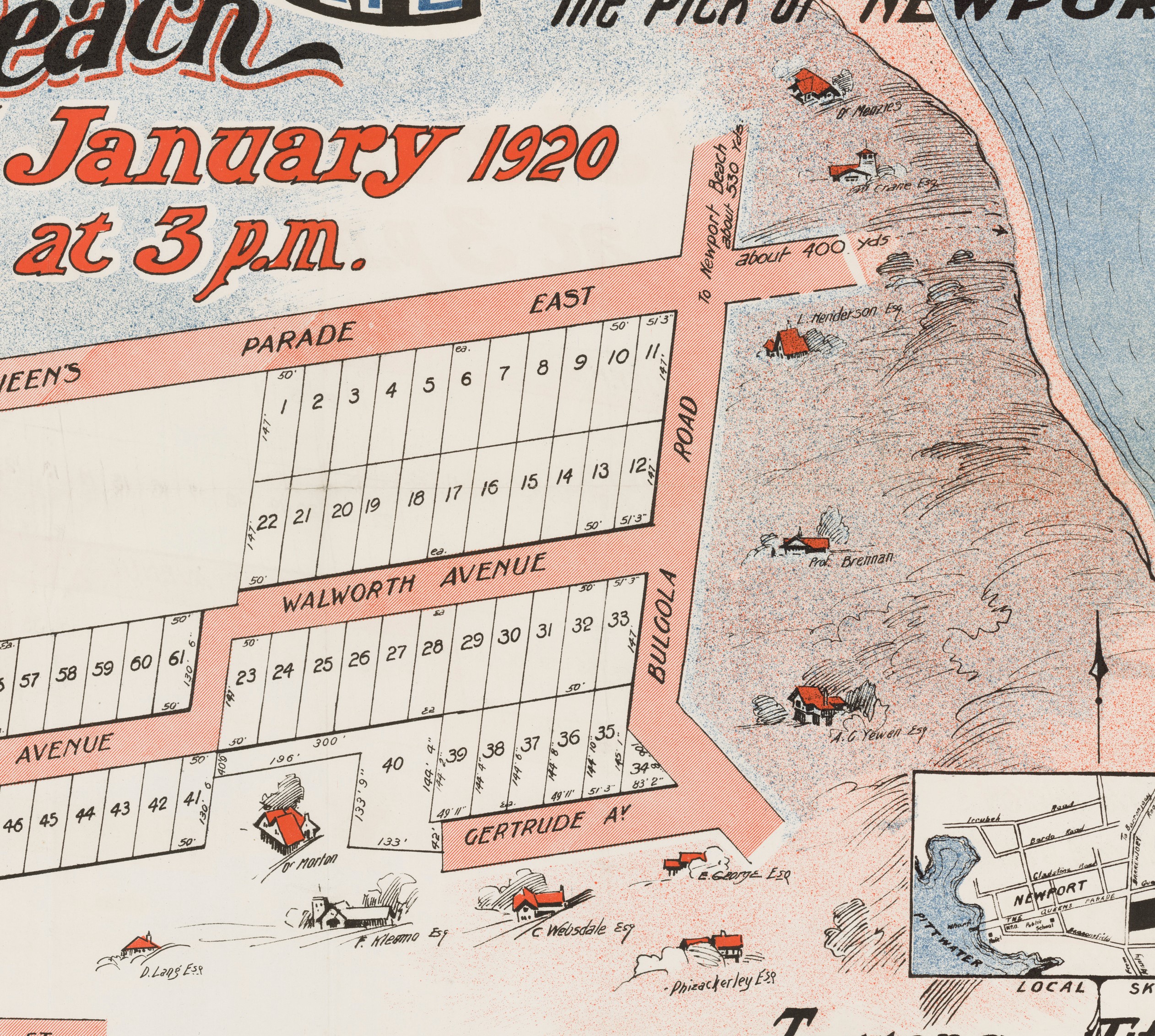 Newport Surf Estate January 3rd, 1920 Item No.: c050400036 Subdivision Materials, courtesy State Library of NSW - and enlarged section showing those who already had holiday homes as marked on the above: names are from top to bottom - Dr. Menzies, W. Crane Esq., L. Henderson Esq., Prof. Brennan, A. G. Yewen Esq., Dr. Morton, D. Lang Esq., F. Kleamo, E. George Esq., C. Websdale Esq., Phizackerley Esq.