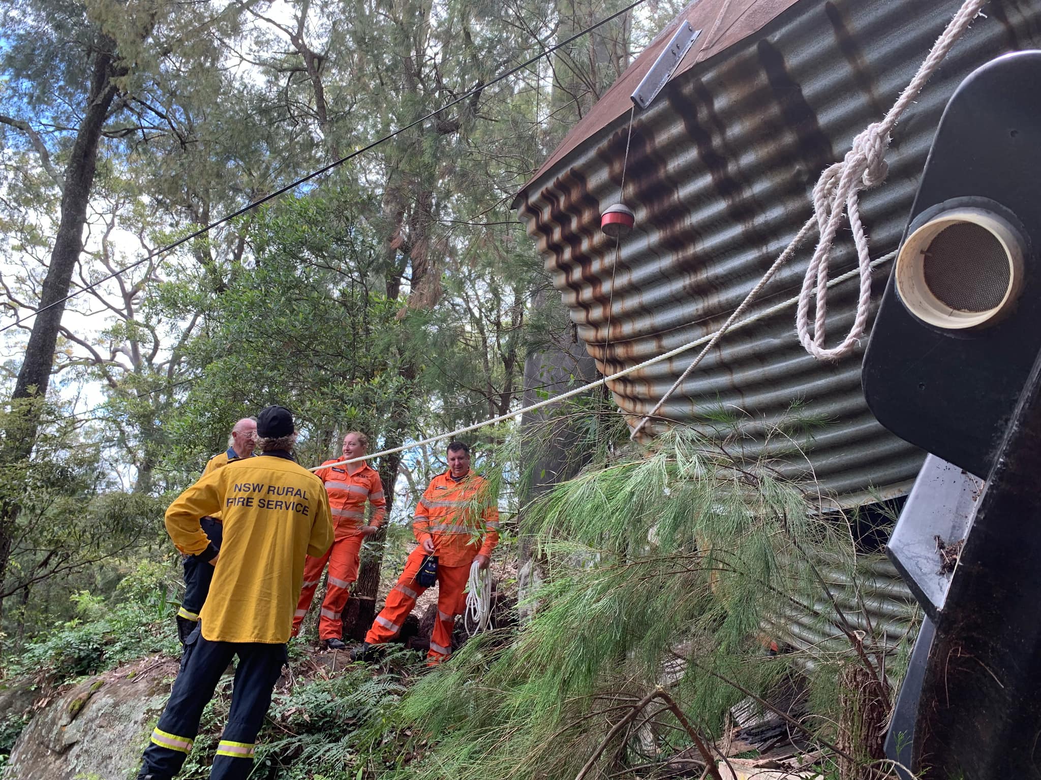 February 10, 2024A busy Saturday morning for volunteers of Warringah Pittwater SES at beautiful Scotland Island. Working alongside RFS, crews stabilised two water tanks that had come loose and were threatening to roll down hill onto a lower property.