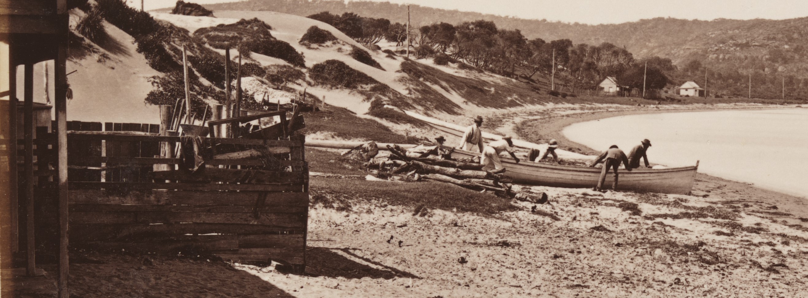 Below: Station Beach, Barrenjoey (Broken Bay), circa 1879-1889 by Charles Potter(Government Printer); and details from (crops) - Photographs, New South Wales [album of views of Sydney, Blue Mountains and surrounds], ca. 1879 / attributed to N.S.W. Government Printing Office and courtesy State Library of NSW: