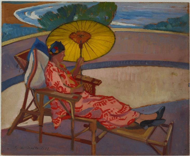 Sydney's newest art alliance, 'A Group of Modern Painters,' which 'is registering its first kick at the Grosvenor Galleries, is showing work by George Lambert, A.R.A., Thea Proctor, John D. Moore, Margaret Preston, Roland Wakelin, Roi de Mostre, Elioth Gruner, Kenneth MacQueen, and Vida Lahey. Mr. Hugh McCrae tells me: 'Prejudices of- taste and education are bound to come in the way of any just- decision as to the .merit of this adventure; .particularly when an adherent trips and strikes an attitude, which is serious, without being dignified. Only a few of the exhibitors have evolved pictures of original conception; while the majority, responding to the influence of the European modernist cult, offer glimpses of nature, cut into slices . . . like sandwiches .. . . dropped in paraffin paper. 'When Roland Wakelin paints a yellow jug, No. 10, quite bent under the weight of his sincerity (?),' says Mr. McCrae, 'I feel certain that he makes it both crooked and yellow, out of politeness towards the critic, so as to give him grounds for something sensible to say. This whim for courtesy is noticeable even by his behaviour towards still-life models, where he has given- up his chair to a beer bottle. Roi de Mestre's 'Palm Beach' has dramatic qualities but his 'Indian Rug' made my last hairs stiffen at the approach. Elioth Gruner's view of Bathurst is meagre in perspective, and I only understand the foreground. Thea Proctor draws grandly, with assurance, and signs of plentiful reserve. From the Notebook of a "Sunday Times" Man (1926, December 5). Sunday Times (Sydney, NSW : 1895 - 1930), p. 4. Retrieved from http://nla.gov.au/nla.news-article128135288