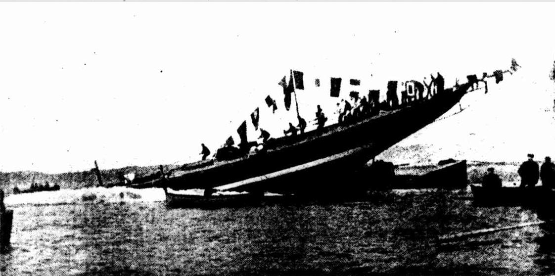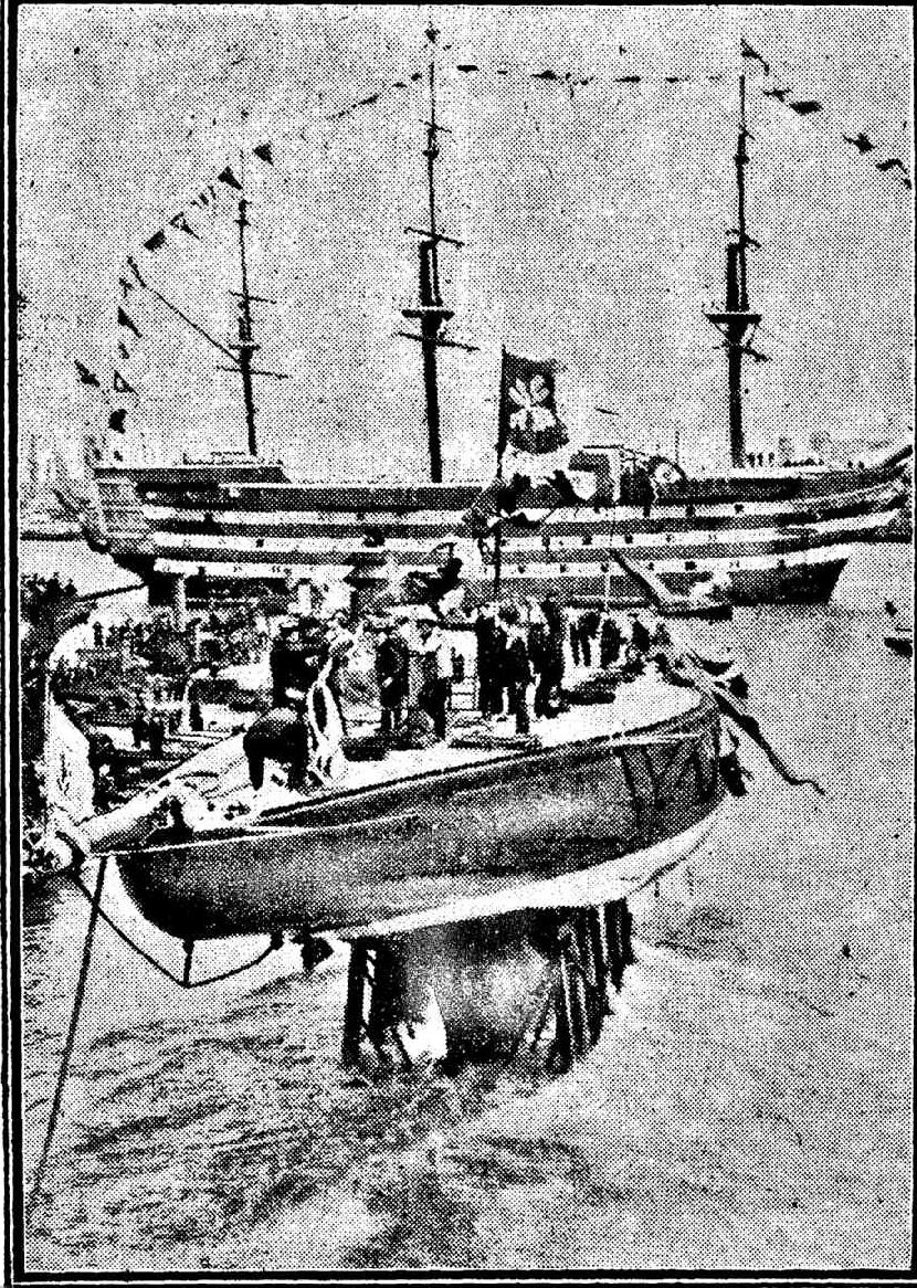 Throughout the course of the lecture Mr Marks described the rigging and the novelties introduced in the building by the designer, Mr Chas. Nicklesen. The mast, even to those unaccustomed to noting such things, appeared an enormous structure, the measurement being 168ft. from the deck. She carried a spread of canvas 13,000 square feet, and the boom stood over 7ft from the decking. Only a slide of a character exhibited last night could convey an idea of tremendous size of the yacht. The entire navigating crew were chosen experts selected from the pick of England's yachtsmen, and to a man they took a pride in their work. The weight of everything on board was tremendous, yet despite this fact the rigging was only of a light character. The crew comprised 32 men competent in their various departments, in the trials the Shamrock IV. was capable of giving Shamrock III. 45 seconds start in every mile and then win. The latter vessel at the time of the trials was the fastest cutter in the world. Prior to setting out across the Atlantic the vessel was at Spithead when the naval review was held, and in starting on the voyage was compelled to pass through 21 miles of steel composed of the might of the English navy. A great ovation was accorded the crew's of both the Erin and the Shamrock IV., which was in tow.