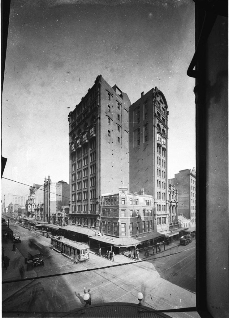 Culwulla Chambers (Sydney, N.S.W.) Corner King & Castlereagh Streets, 1918-1932. Photo by Hall & Co. Album: Hall Collection : photographs of Sydney streets, buildings and people, 1900s-1930s, courtesy State Library of NSW, Home and Away - 34761