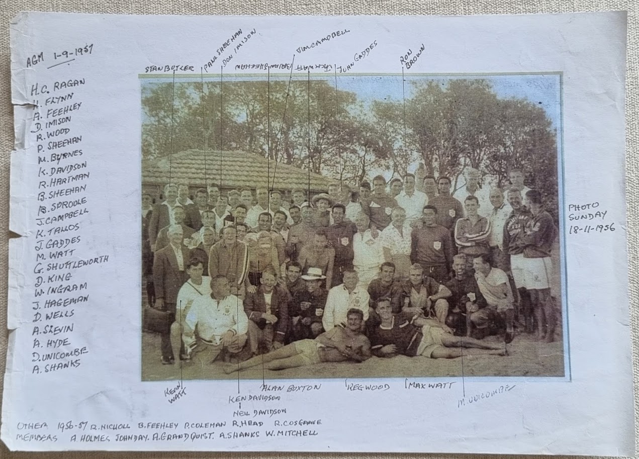 Reg Wood is the young fellow reclining in front, left side of the photo - according to Norma Watt, wife of the late Max Watt who’s the fellow reclining on the right side of the photo. Image courtesy Avalon Beach Historical Society.