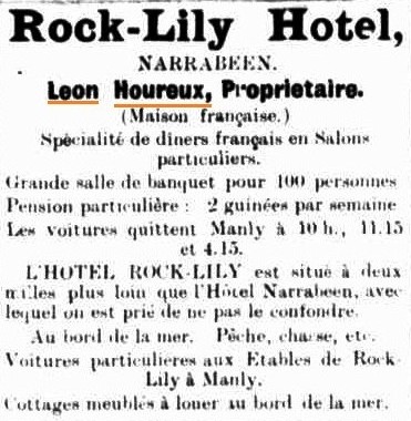 After having partaken of light refreshments, a good assortment of which will be found here, we once more resume our journey, and after about three quarters of an hour's lovely drive through some of the prettiest scenery in the country we pull up in front of a most comfortable and picturesque hotel at Rock Lily, owned by Mr. Leon Houreux. Madame Houreux is a most hospitable proprietress, and the rooms are most tastefully decorated in oil colors by Mr. Leon Houreux-stirring scenes on sea and land-the pictures well worth gazing at, not only from an artistic point of view, but as curiosities in such a pretty wayside inn. The gardens are laid out in good style. The tame and harmless native bear, the noisy laughing jackass, and the prying magpie are to be found here, making up a tiny and interesting menagerie. Mr.Leon Houreux evidently understands the way of catering for the public, as you can obtain the most recherché Parisian dinners here at a reasonable figure. After having partaken of a choice lunch, with a bottle of real 'French claret, of which he is an undoubted judge, you once more resume-your seat on the coach, and proceed to Newport, to arrive there in time for tea. A Christmas Holiday Trip. (1893, November 25). Illustrated Sydney News (NSW : 1881 - 1894), p. 14. Retrieved from http://nla.gov.au/nla.news-article63104125
