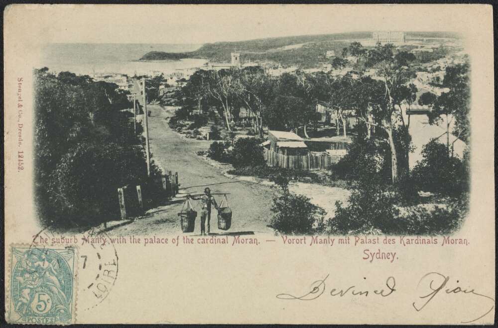 The suburb of Manly with the palace of Cardinal Moran, Sydney = Vorort Manly mit Palast des Kardinals Moran. Circa 1890, courtesy National Library of Australia http://nla.gov.au/nla.obj-153091490