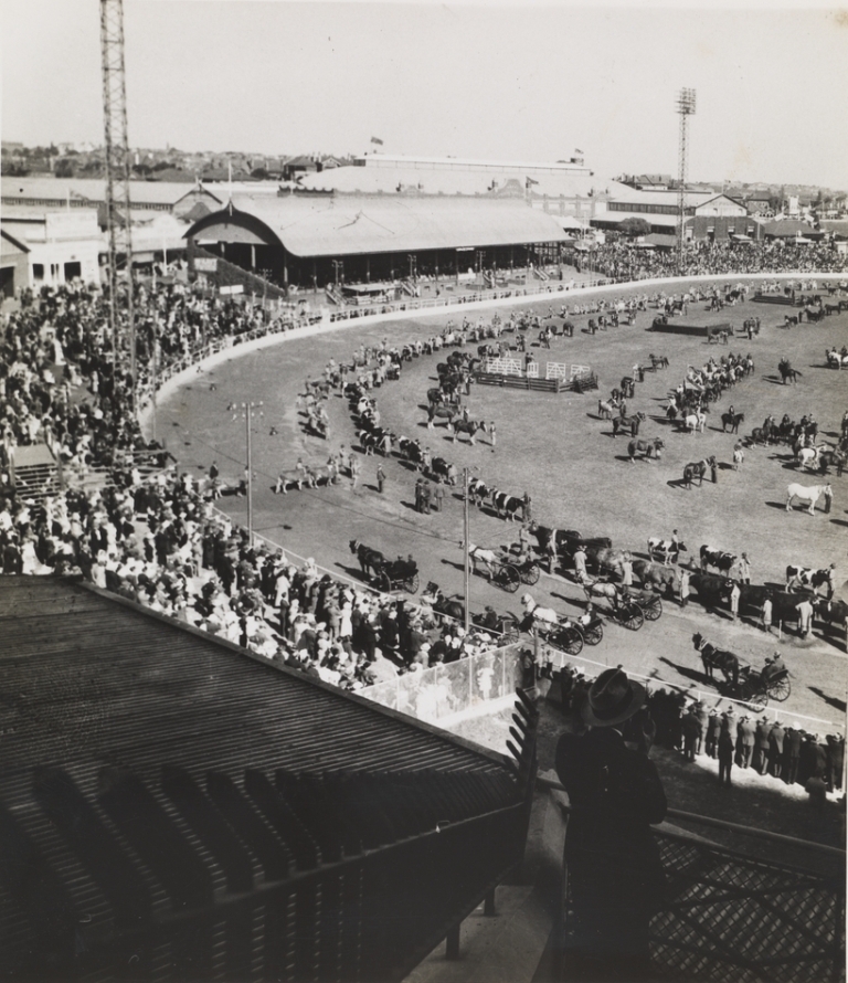 Grand parade, Easter Show, circa 1925 to 1955, from album: Hood Collection part II : [Royal Agricultural Society Showground: Easter Shows, Sheep Shows, Highland gatherings, etc. (and including other agricultural industry scenes)] courtesy State Library of NSW, the Mitchell Library. Image No.: a359002h