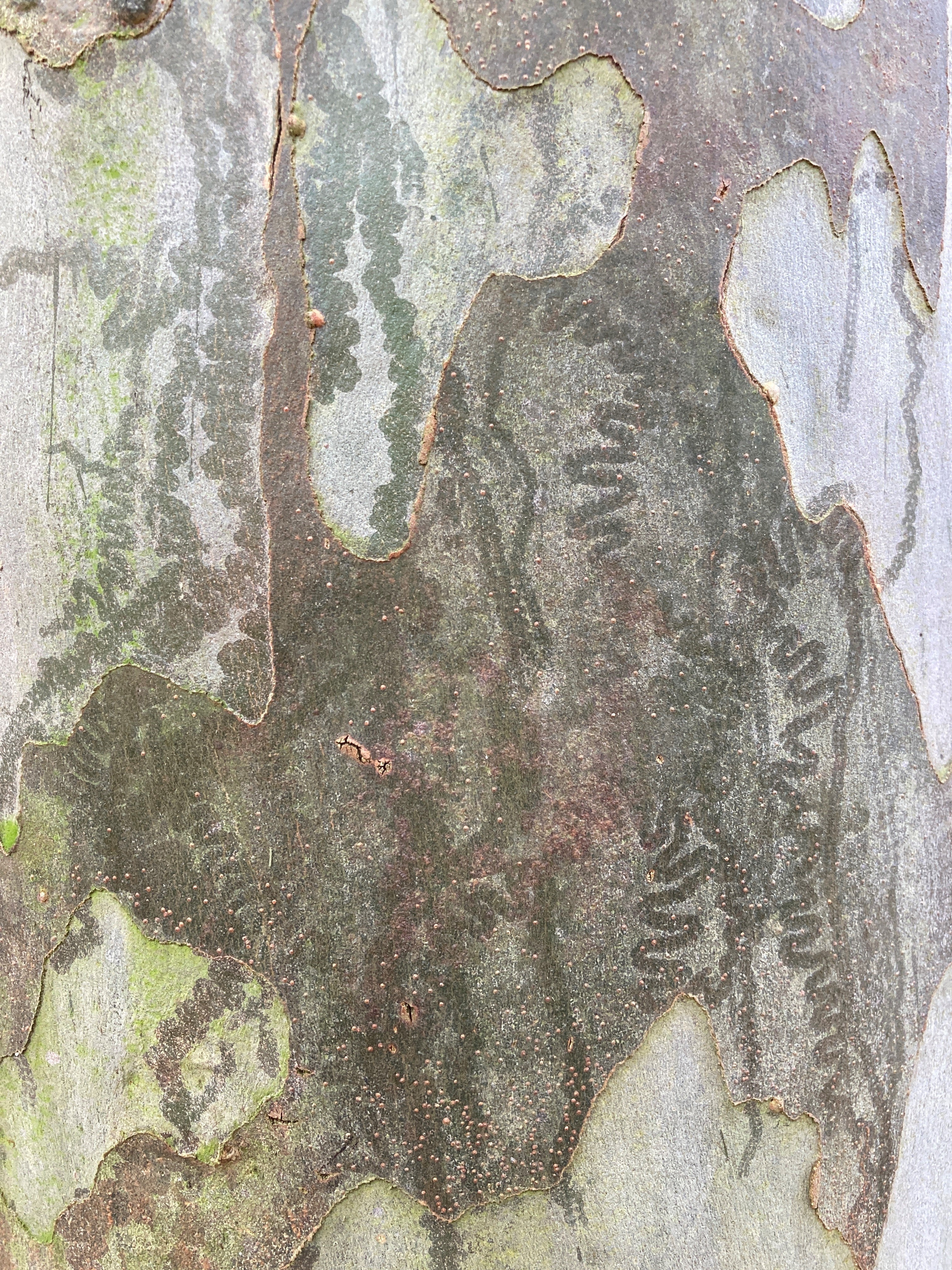 Wiggly lines are feeding trails of the native Red Triangle Slug, feeding algae on the trunk.