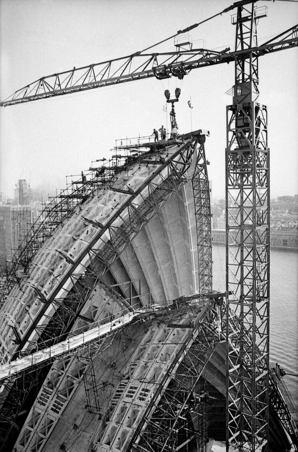 The highest segment on the roof of the Sydney Opera House is moved into position in 1967. Photo: Martin Brannan - Fairfax Archives
