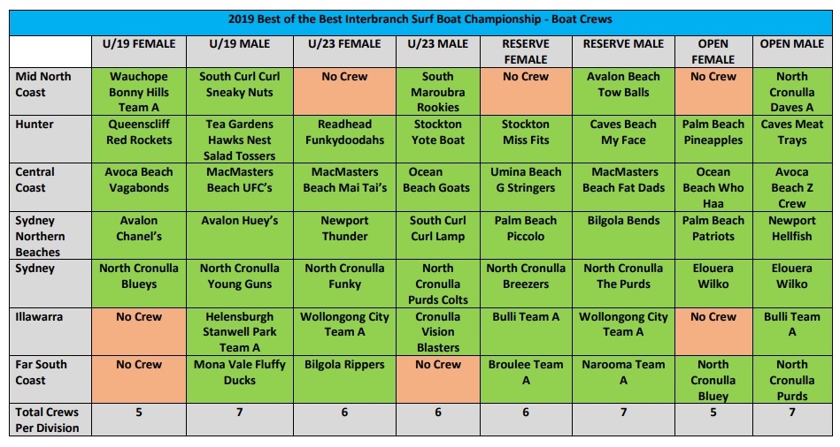 By virtue of a shorter travelling distance and running well established surf boat series the branch team of Hunter, Central Coast, Sydney, and Sydney Northern Beaches will field a team in every division.