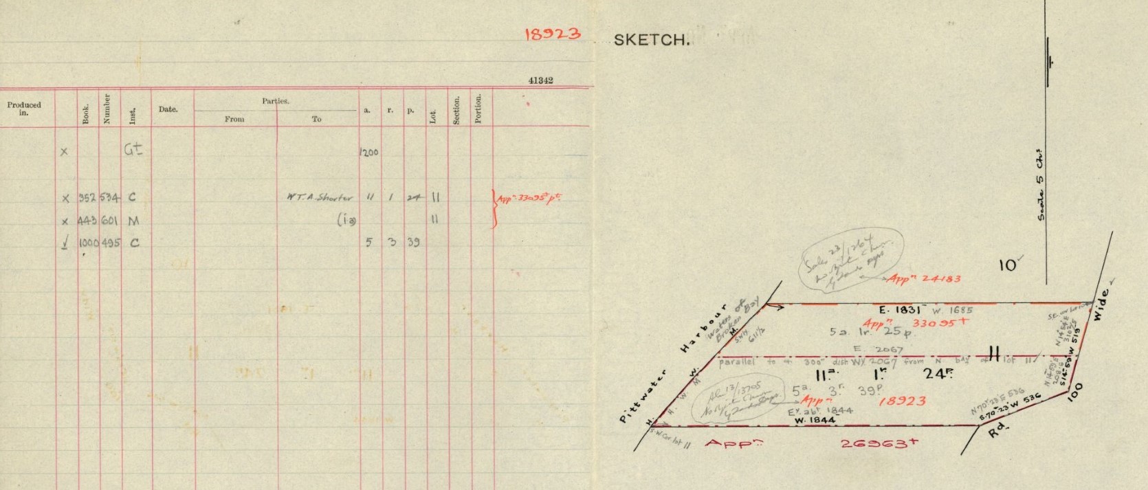 William Shorter was a Solicitor who practised from premises at 118 Pitt Street from the 1860s. In 1912 it appears he became bankrupt – which was when part of his land was sold. Shorter: Primary Application [PA 18923]- two lots; one of 11 acres, 1 rood and 24 perches, one of 5 acres, 1 rood and 25 perches.