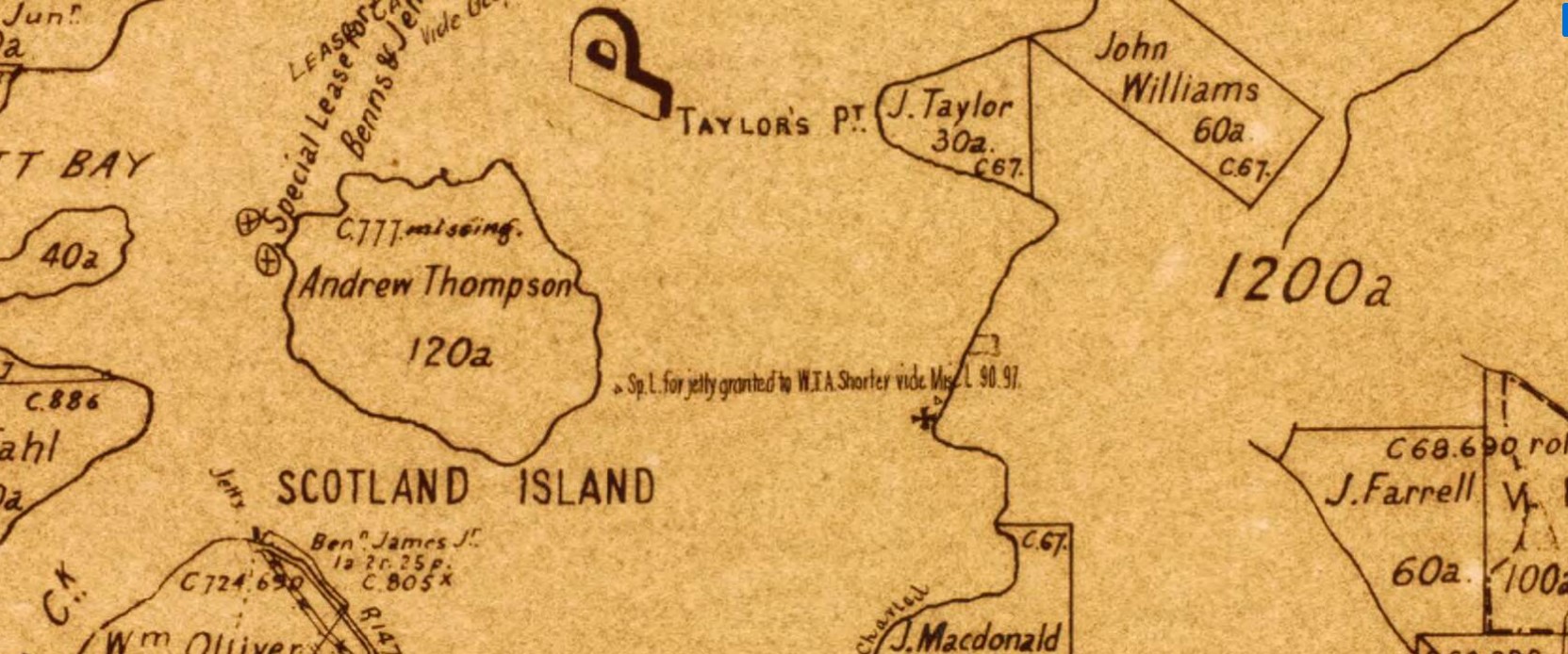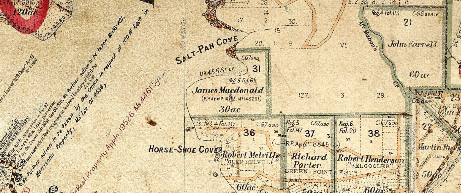 On the south extent, Newport side, Salt Pan Cove was originally a land grant to James MacDonald and beside him, going south, Robert Melville had the land grant.