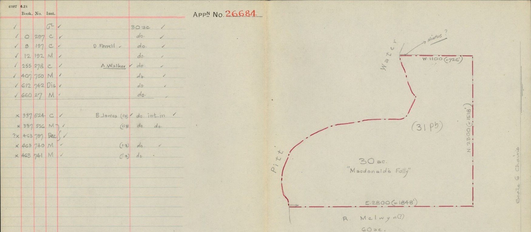 The later history of Daniel Farrell’s land (James McDonald’s grant) is interesting. The mortgagee, F.N. McCron assumed ownership, leased it to various people, and after his death, his widow and his eldest son sold it to Arthur Walker on 21 August 1882. Walker applied to have the grant brought under the Real Property Act, but John Farrell III entered a caveat against his application, and Walker’s application was rejected in 1900. Meanwhile, Daniel Farrell II (the son of John Farrell II) sold the land, together with other parcels of land, to Benjamin James on 29 April 1886. On 6 April 1925 John Farrell III eventually lodged a successful application, based on possession, and sold the land soon afterwards. The Farrell family thus appears to have benefited three times from the same piece of real estate! [LTO PA 10712, 26684]