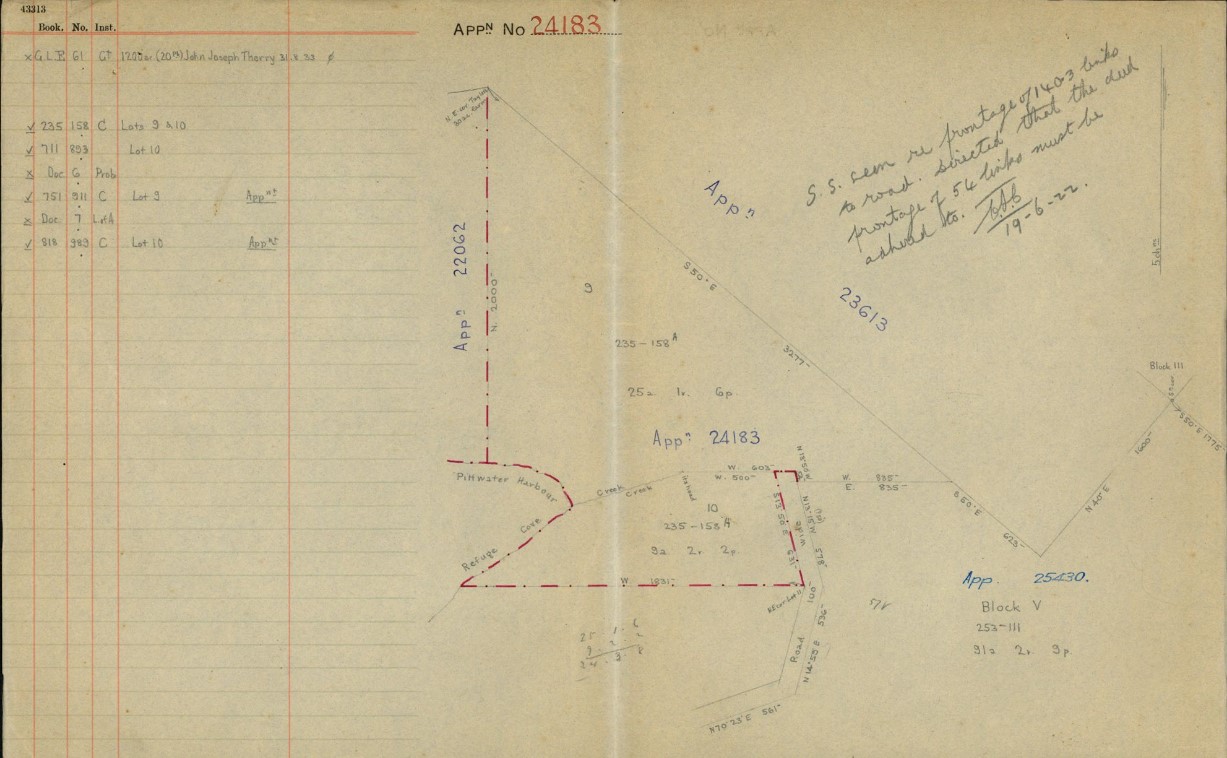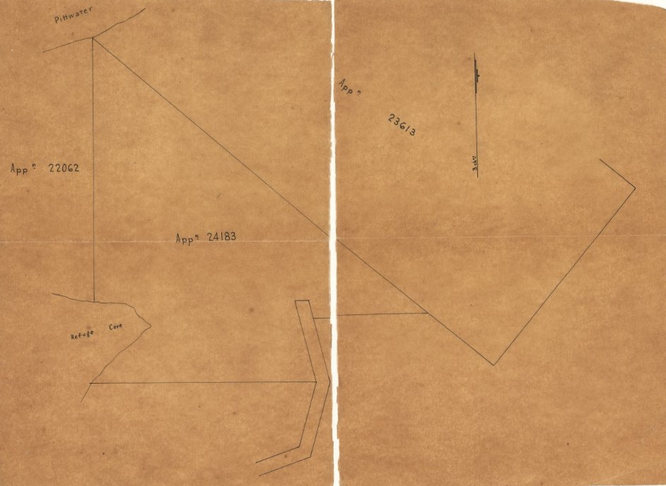 Primary Application Number: [PA 24183] encompasses Lots 9 and 10 of the South Division V of the Therry Estate and the bay of Refuge Cove, Pittwater. This was bought by Dr. Frederick Milford in 1881, a founder of the Royal Sydney Yacht Squadron and the Prince Alfred Yacht Club. These two sailing fraternities were both looking for a Pittwater base, with fellow RSYS member James Frederick Elliot buying over 29 acres on Careel Bay, as that was to be the RSYS base, and was their 'Pittwater chapter' and bay into the 1970's, and the Milfords cleaning up on the other side of the run from Stokes Point to Clareville and on into what we today call 'Newport'.