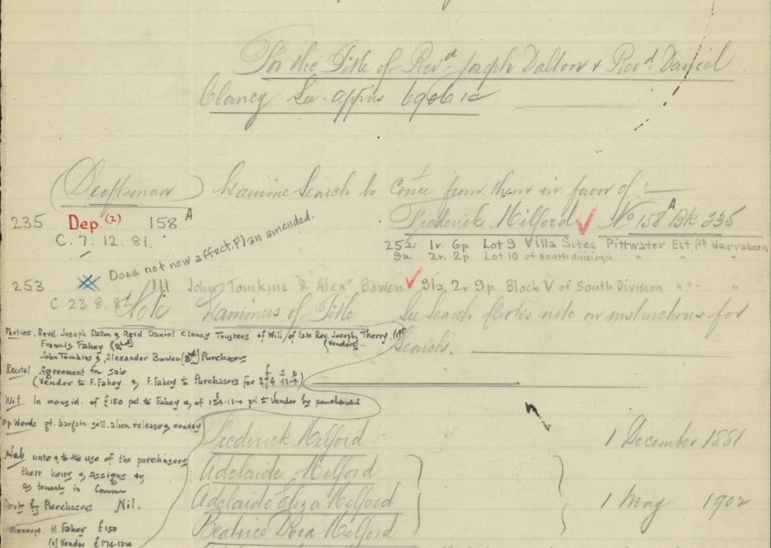 Primary Application 26684 records Benjamin James's acreage sales and that in 1924 John Farrell III claims back 45 acres; Vol-Fol 3776-92- Portion 31 of Pittwater. On September 15th 1925 the Certificate of Title is registered. Some sources state he paid £3000 for this but the Certificate of Title does not state this is so; it is more likely he earned £3000 through the land sales of Mr. Fitzpatrick.