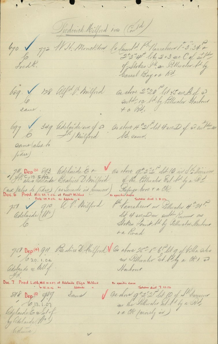 HRLV's Vol-Fol 3441-134 records the Certificate of Title registered on April 14 1923, shows 31 acres, 3 roods and 5 34/perches, apart for a section for Hudson Parade, went to Beatrice Dora Gooud, one of his by then married daughters. Beatrice sold the holding to Leslie Wallace, Conveyancer in 1927, who onsold to Jean Rothery, spinster, in 1930 - this then becomes Vol-Fol 4454-98. Just a few pages from that PA to show some of this list: