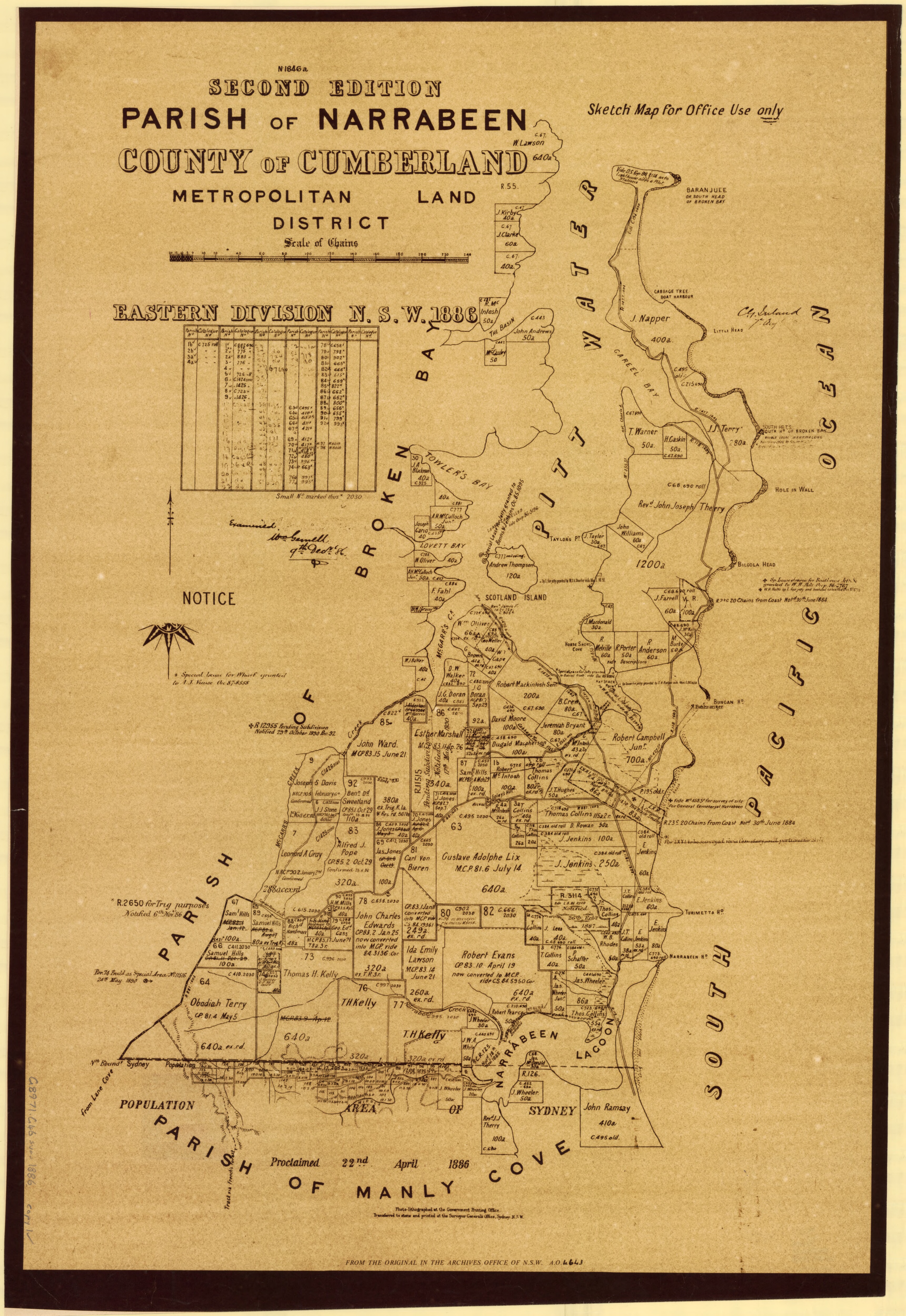No. 18,923. APPLICANT: James McKinlay, Marrickville. LAND: County Cumberland, parish Narrabeen, shire Warringah, 8 acres 1 rood 12 1/2 perches, on Pittwater, near Refuge Cove,—part lot 11, Villa Sites Pittwater Estate, and is part 1.200 acres (portion 20, parish), granted to John Joseph Therry; adjoining properties of A. E. Wickham and — Kilminster. NOTICE UNDER REAL PROPERTY ACT. (1913, December 10). Government Gazette of the State of New South Wales (Sydney, NSW : 1901 - 2001), p. 7336. Retrieved from http://nla.gov.au/nla.news-article228061585 - Primary Application Number: [PA 18923]; James McKinlay 8 acres 1 rood 12 1/2 perches on Pittwater near Refuge Cove in Shire Warringah County Cumberland Volume 2437 Folio 104