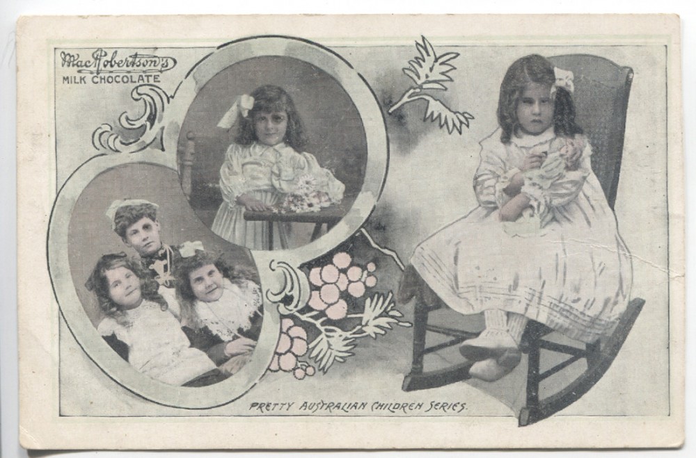 There has been a large demand for a confection. known as "milk chocolate " during the last two or three years, and the consumption at the present time throughout the world runs into many hundreds of tons annually. Last year MacRobertson and Co. imported a lot of expensive machinery for the purpose of turning out milk chocolate. Subsequently they manufactured the line and put it on the market, with good results. More recently they gave a prize for a number of photos of Australia's pretty children, to be reproduced in the shape of postcards, which of course advertise the firm's milk chocolate. The whole of the work is thoroughly Australian, the chocolate, the subjects, the lithographic work and the cards themselves. It is claimed that those are the most artistic set of postcards ever printed in Australia. Milk Chocolate Postcards. (1905, November 24). The Telegraph (Brisbane, Qld. : 1872 - 1947), p. 5 (SECOND EDITION). Retrieved from http://nla.gov.au/nla.news-article173417761