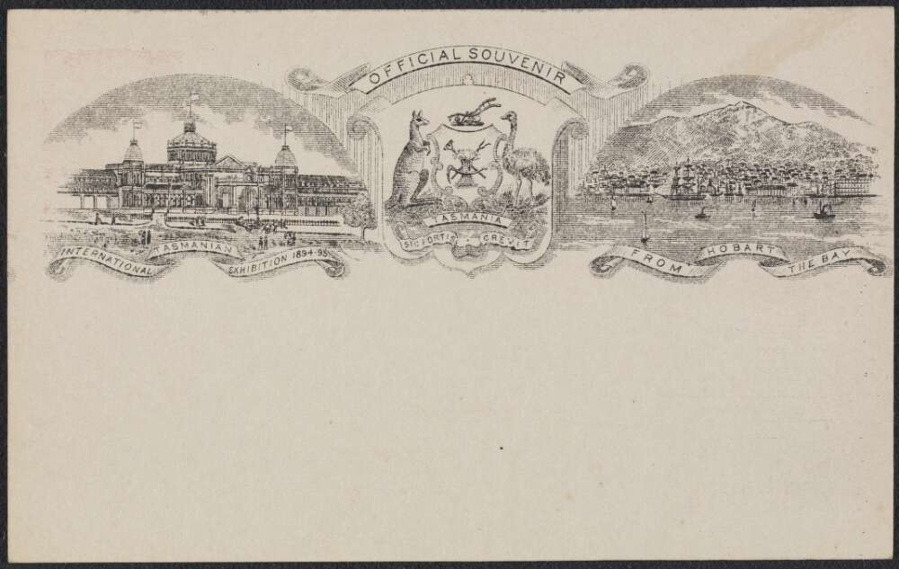 Tasmania copied this example for its own 1894 Exhibition and although there had been decorative edges featured on the New South Wales postal cards, the Tasmanian one is deemed Australia’s first picture postcard. This was of a general view of Hobart and the exhibition building.