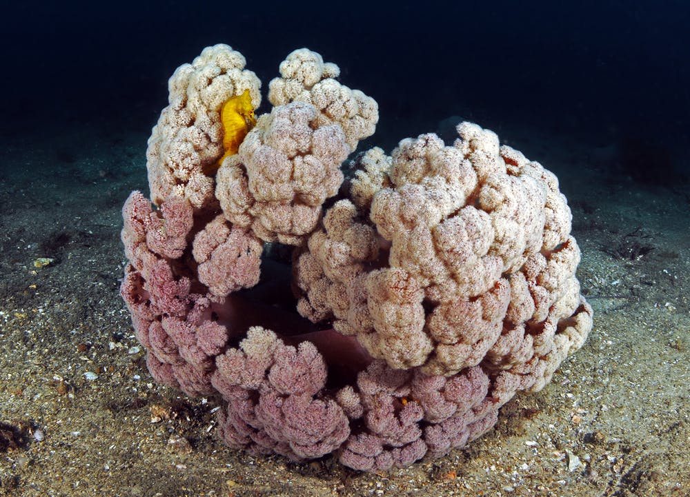 These lost traps over time become magnets for marine growth which naturally starts to occur within days. As the growth increases over time, fish and invertebrates would move onto these new artificial homes. A few seahorses were even spotted living on them.