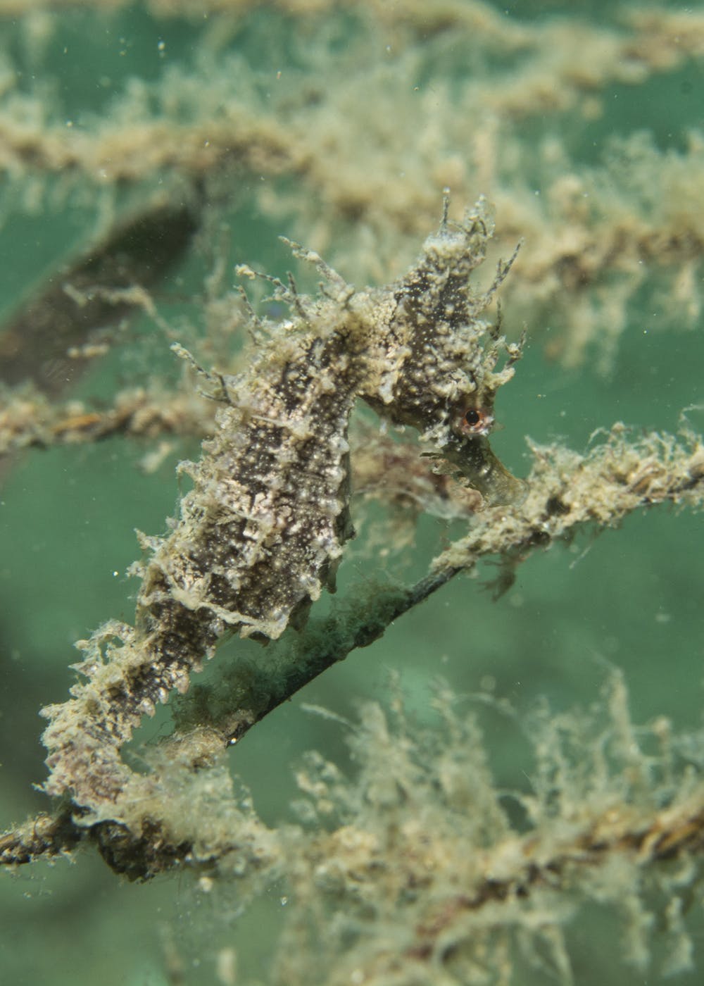 A baby seahorse clinging to the hotel after months of marine growth. Author provided