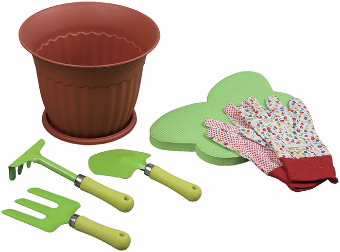 Includes butterfly design kneeling pad, garden gloves, 3Pce garden tools & planter pot.