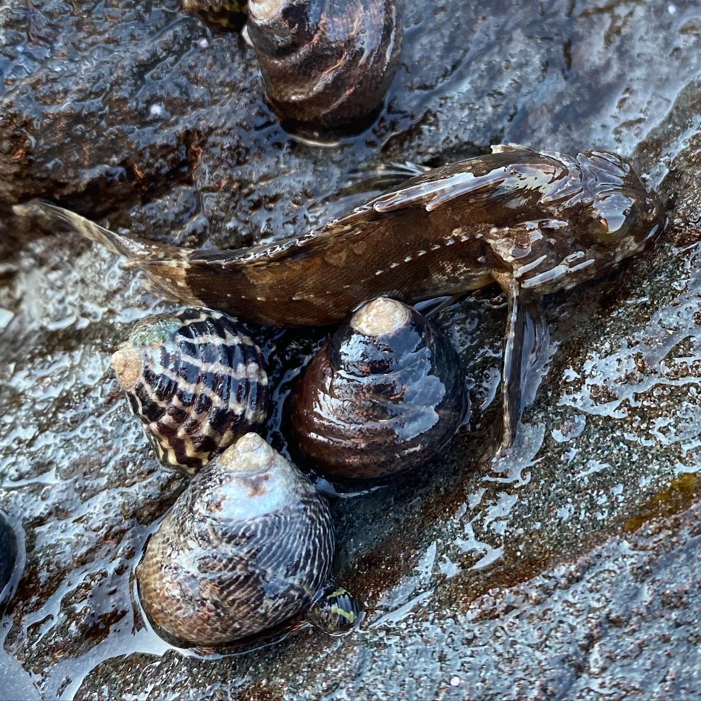 Conniwinks Shells and eggs. (Sally was down here two weeks ago and there were masses of them filling all the crevices on the rock shelf). The shell here has a few 'freeloaders' catching a faster ride;