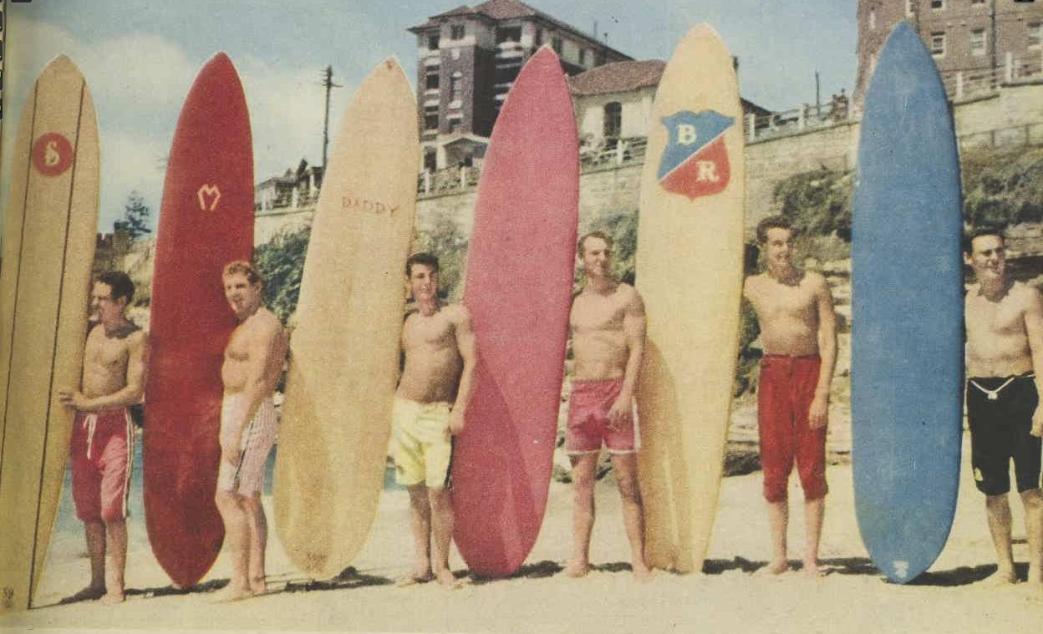 IN LINE on South Bondi Beach are members of the South Bondi Board Club. From left are Scott Dillon, "Bluey" Mayes, Andy Cochran, Rod Cartlidge, Barry Ross, and Des Price. Some wear long pants, and have foam rubber built into the knees, to protect their legs, especially when paddling their surfboards out to catch a wave. From Hot doggers' of the surf (1958, December 3). The Australian Women's Weekly (1933 - 1982), p. 3. Retrieved from http://nla.gov.au/nla.news-article48077087