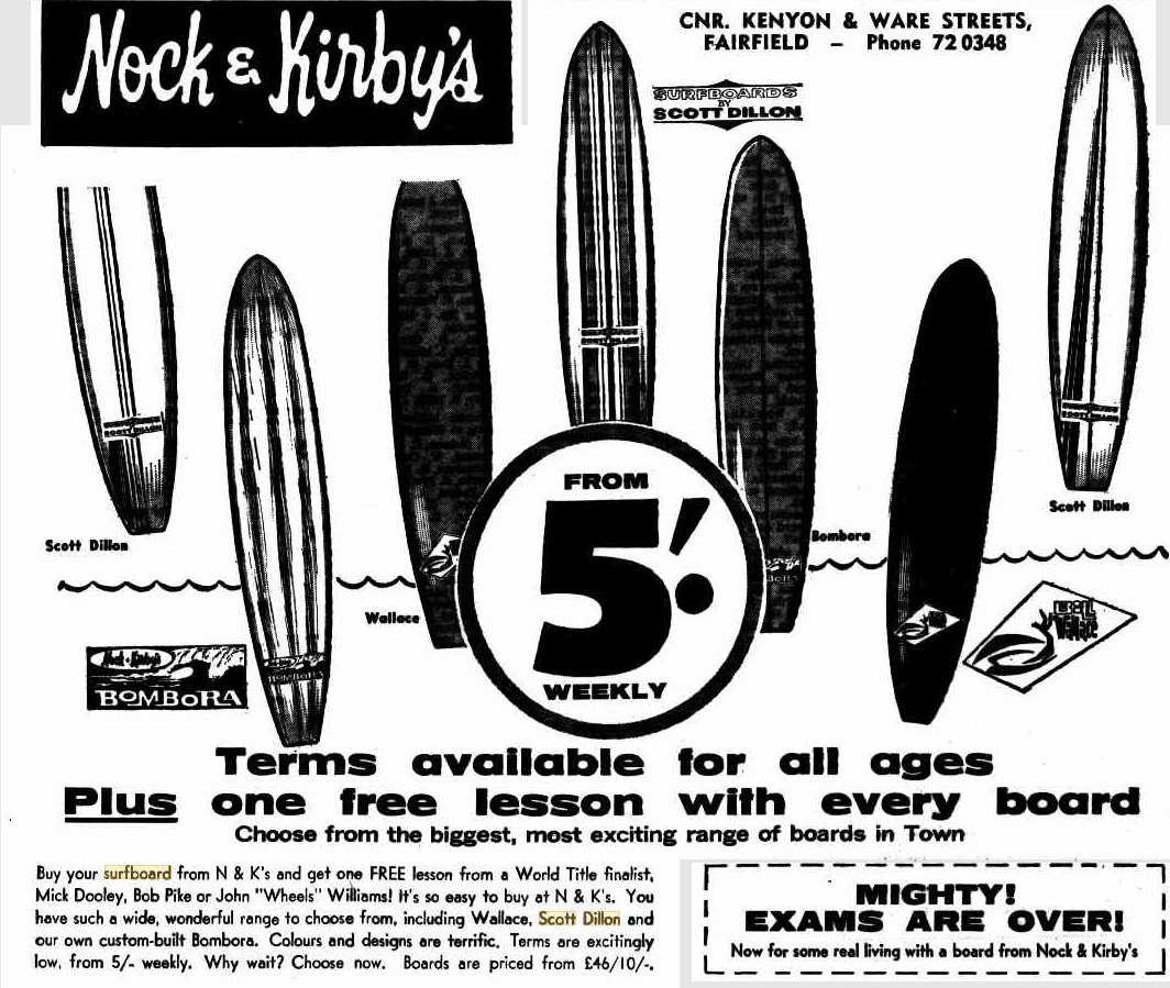 The store, Nock & Kirby's, with a branch in Fairfield, is offering all types of surfboards in its easy purchase scheme for teenagers. A complete range of boards, including famous names such as Scott Dillon, Wallace, and N & K's own Bombora, are available. Since the offer was introduced; there has been a large Influx of teenage business, according to a store spokesman. BOARDS FOR TEENAGERS (1964, November 25). The Biz (Fairfield, NSW : 1928 - 1972), p. 2. Retrieved from http://nla.gov.au/nla.news-article189523809