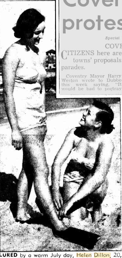 LURED by a warm July day, Helen Dillon, 20, of Bondi adjusts flippers for Berenice Harry, of Bellevue Hill. Both swam at Bondi. SURFING IN THE SUN (1951, July 29). The Sun (Sydney, NSW : 1910 - 1954), p. 44. Retrieved from http://nla.gov.au/nla.news-article230226456