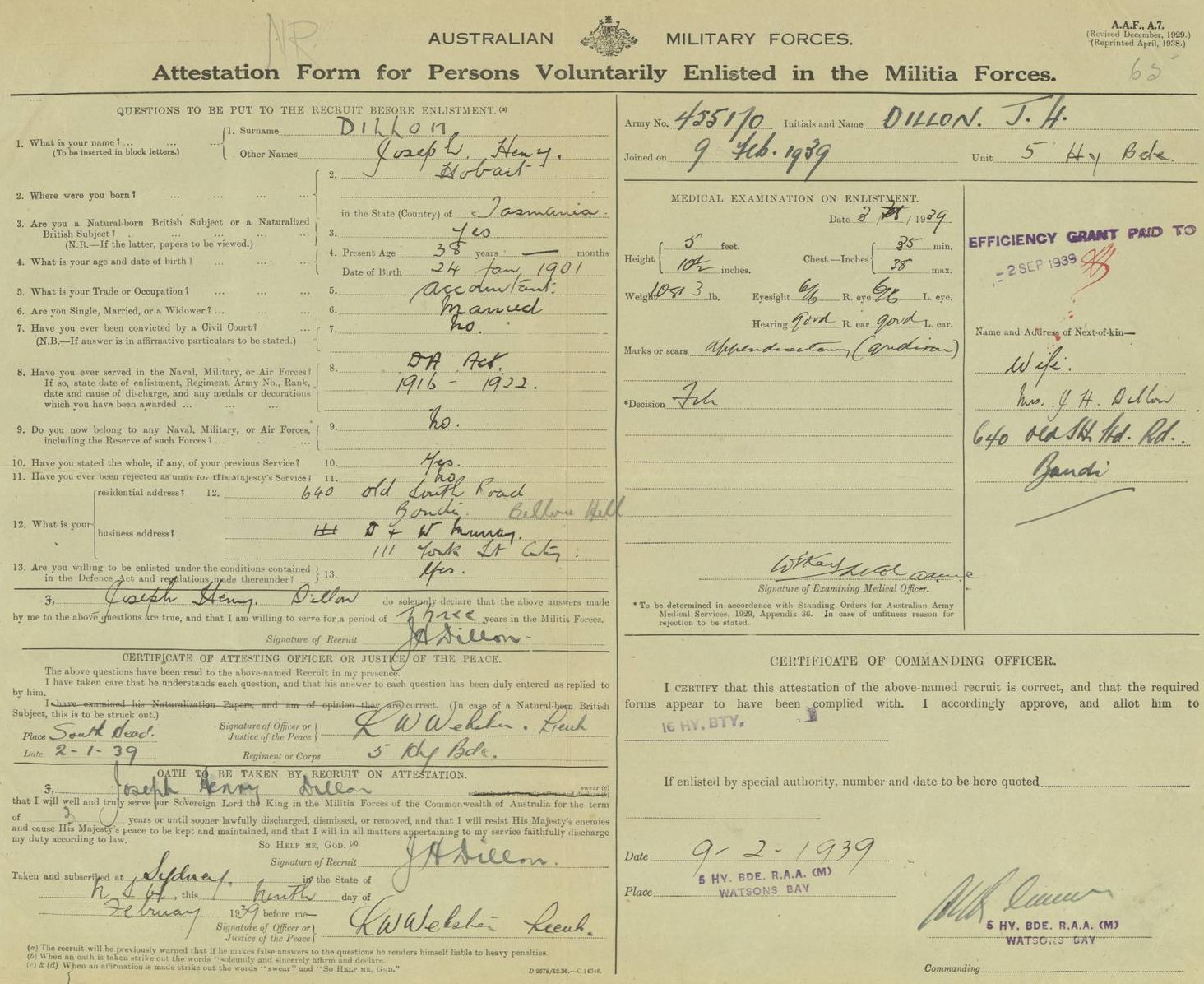 J. H. Dillon, whom his mother had moved back to Sydney later in 1917, served in WWII in 5th Brigade the Reg. Reserves: