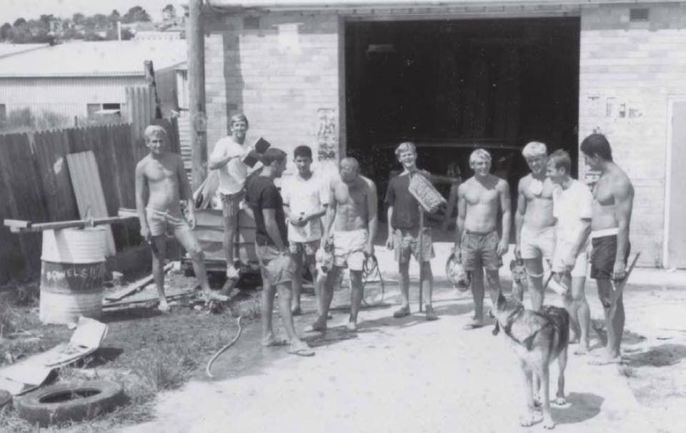 Left to right: Peter Wright, John Wheels Williams, Scott Dillon (in black t-shirt), Chris Beacham, Jim Pike, Swavo, Mick Dooley, Warrick Smith, Gordon Merchant, Ron Adler, Zane the guard dog at Scott Dillon's factory Winbourne road Brookvale Thanks to Diana Dooley for information.