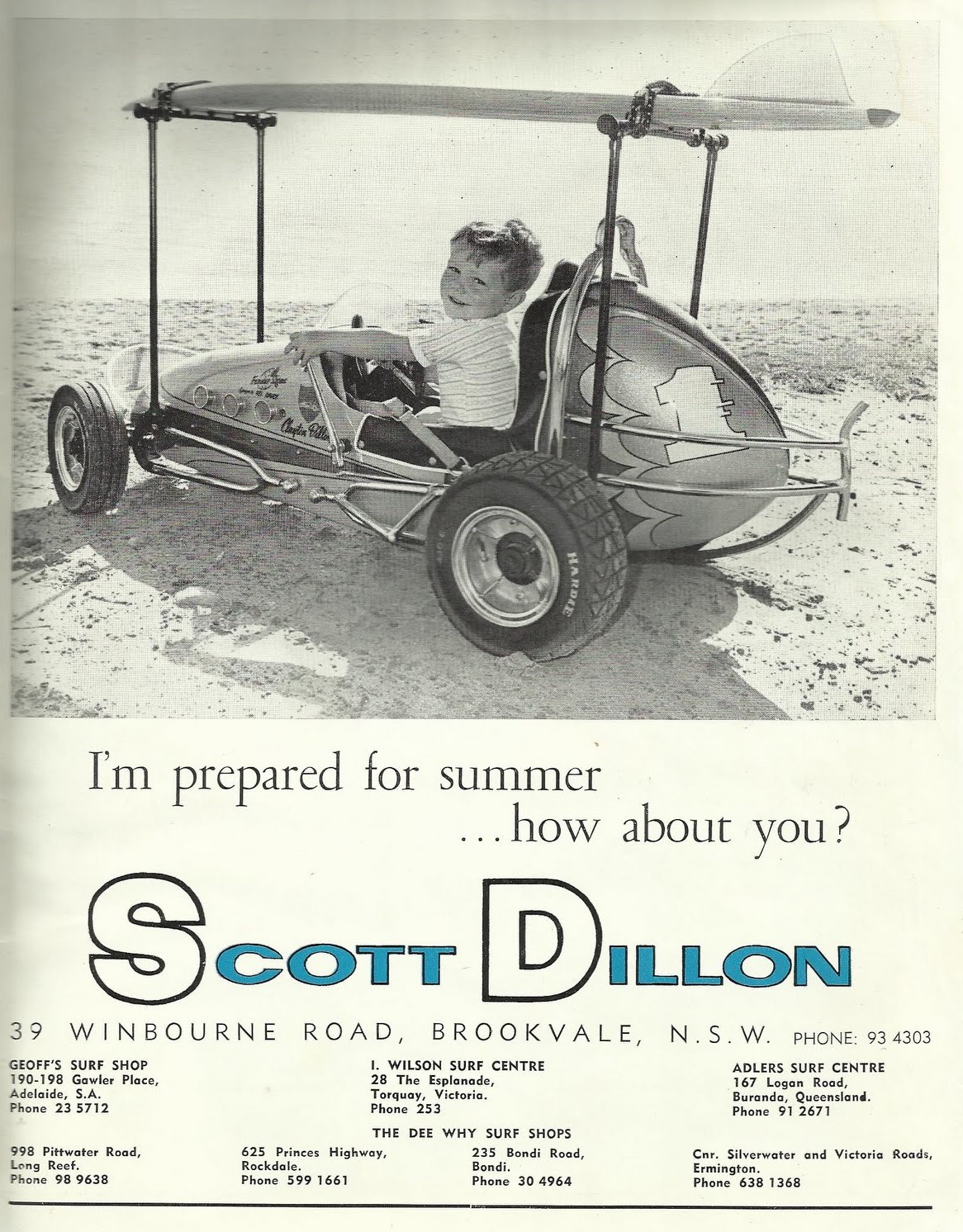 Scott Dillon and crew advertising Baron Surfwear, 1968. Surfing World, September 1968, Volume 11 Number 3 page.
