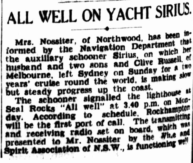 ALL WELL ON YACHT SIRIUS. (1935, July 17). The Sydney Morning Herald (NSW : 1842 - 1954), p. 12. Retrieved from http://nla.gov.au/nla.news-article17178788
