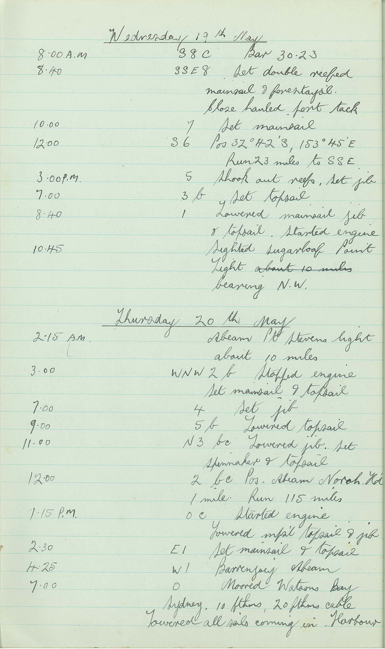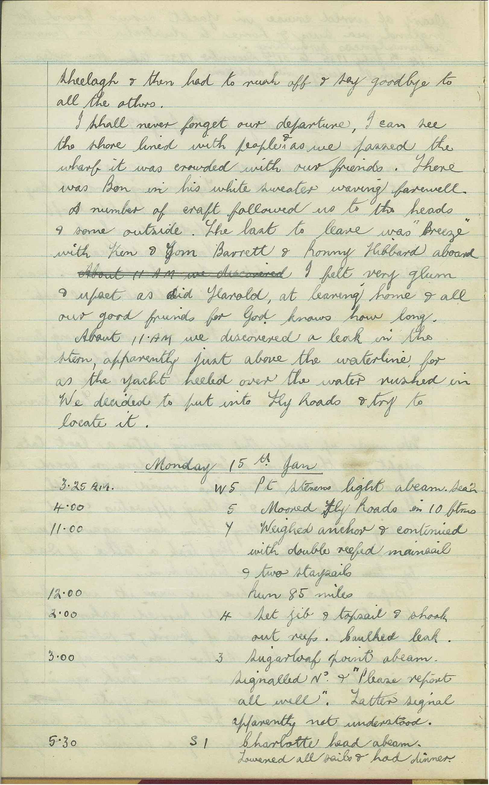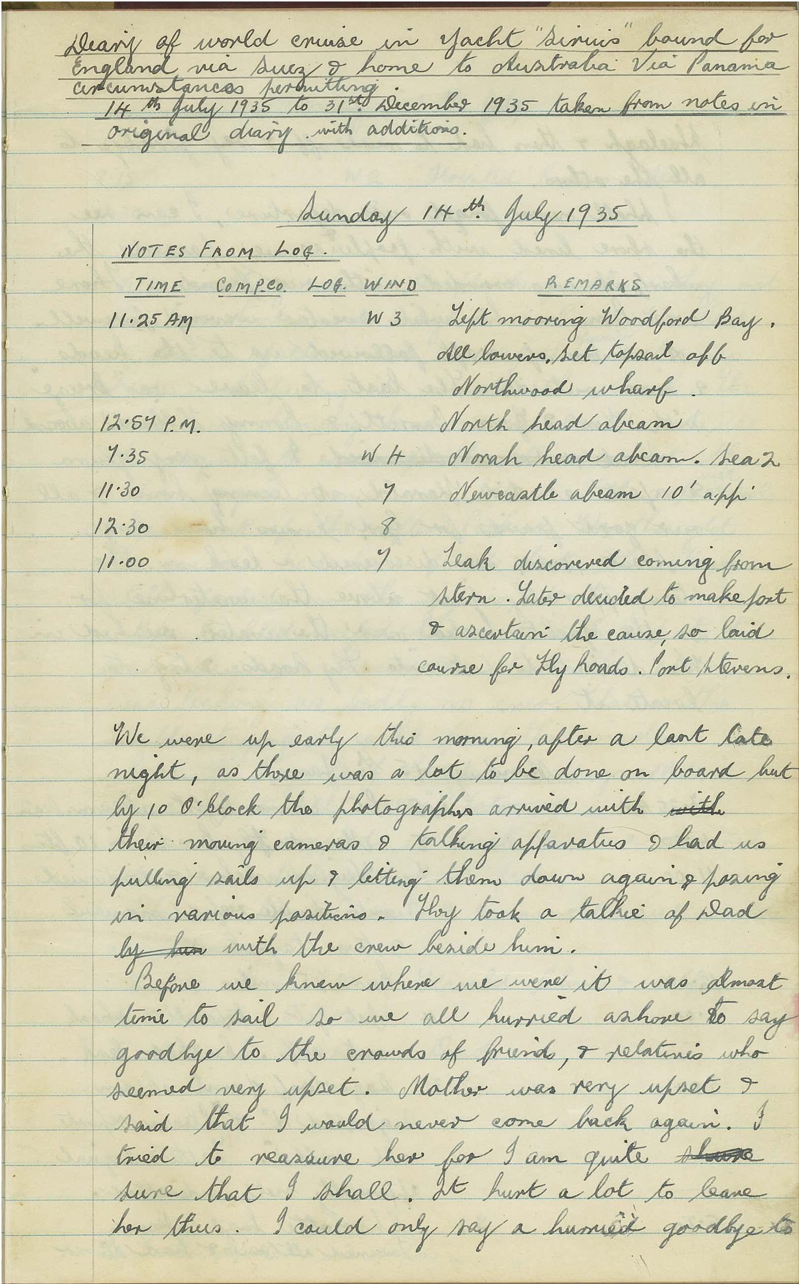 On Sunday July 14th, Nossiter, his two sons Harold and Richard, along with Clive Russell, duly left Sydney Harbour. Richard, who kept the Ship's Log, recorded;