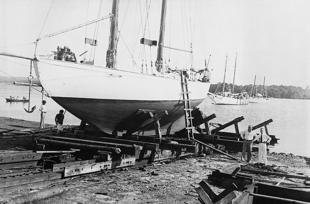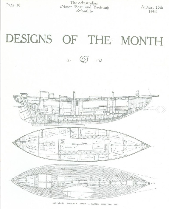 10 August 1934: 'A large schooner now being built by this firm for Mr. Nossiter has created quite a deal of interest among yachtsmen throughout the Commonwealth ... The service for which the yacht is intended, viz.,"Around the World Cruise," has made it imperative that the timber selected and the workmanship throughout be first class'.