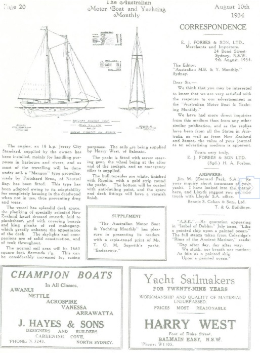 'Australian Motor Boat and Yachting Monthly' magazine also carried a number of reports of her construction in its 'Round Slip and Yard' column: